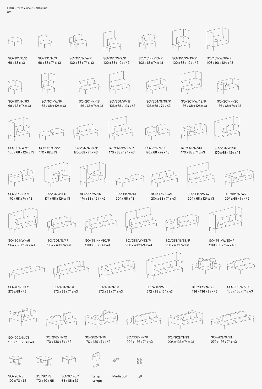 Sona basiert auf acht Grundgestellen, bei denen im Rahmen der gewählten Anordnung die Polsterhocker oder Tische eine Sitzreihe teilen oder beenden können.
