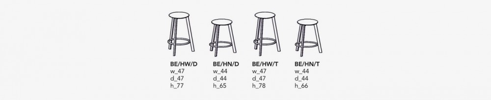 The stools are offered in two heights. 65 and 77 cm for version with wooden seat. 66 and 78 cm for version with upholstered seat.