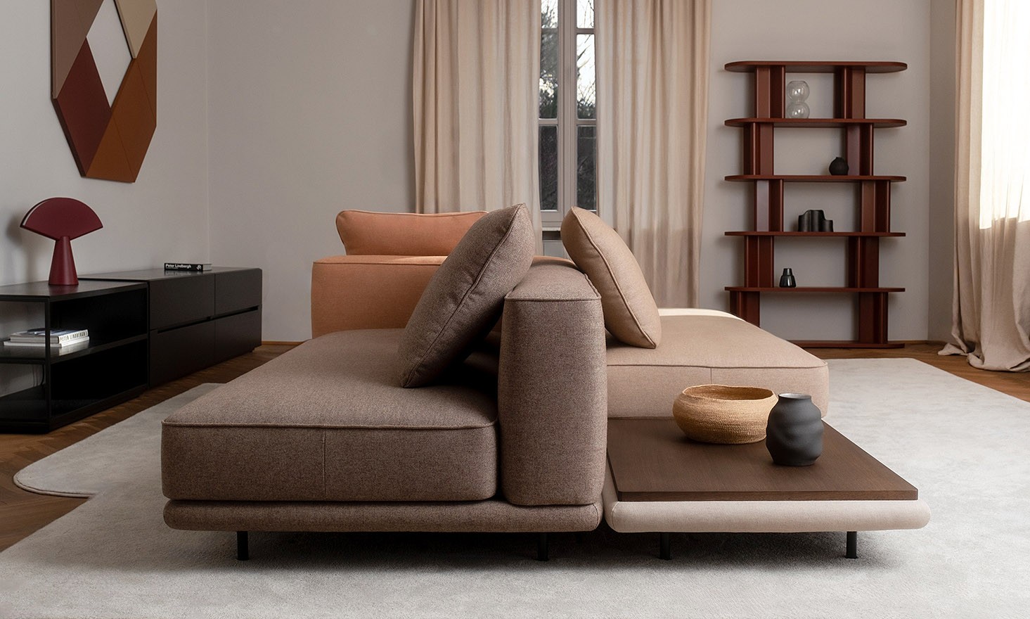 Topo modules function as independent islands that can be freely combined. Backs, armrests, side tables, mediaports, and planters allow for configurations suited both to everyday domestic use and to the demands of contract and public spaces.