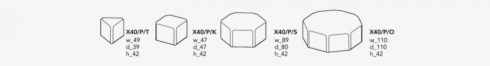x40 is a family of four pouffes with polygonal (triangular, square, hexagonal and octagonal) bases.