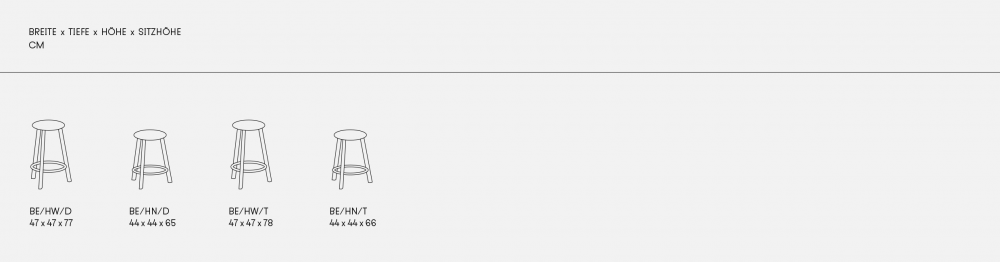 Die Hocker werden in 2 Höhen angeboten. In einen Version mit Holzsitz: 65 und 77 cm. In der Version mit gepolstertem Sitz: 66 und 78 cm.