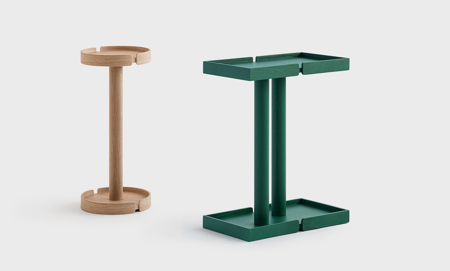 Sie wiederholen in kleinerem Maßstab die gleichen Grundelemente - das Fundament als Tischbasis, die Säulen als Beine und die Decke als Tischplatte. Allerdings gibt es hier weniger Symmetrie als bei den Klassikern, die Proportionen sind massiver und die Formen stärker ausgeprägt. Die Linienführung der Tische, insbesondere der höheren, erinnert an Buchstabenformen mit charakteristischen Serifen.