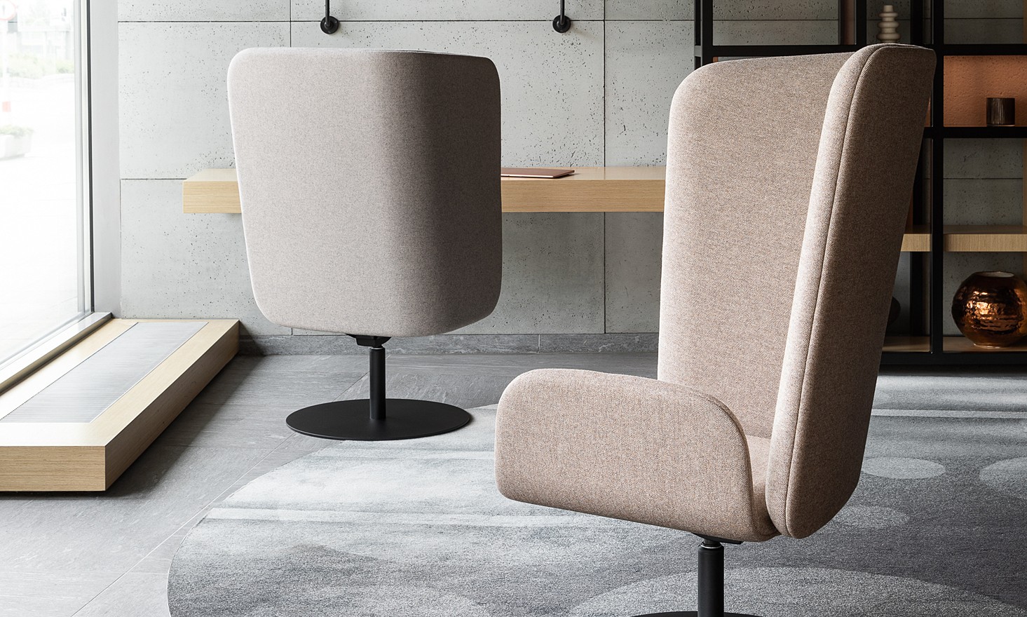 Shieldon ist ein bequemer Drehsessel, dessen Form eine Abgrenzung vom offenen Raum ermöglicht.