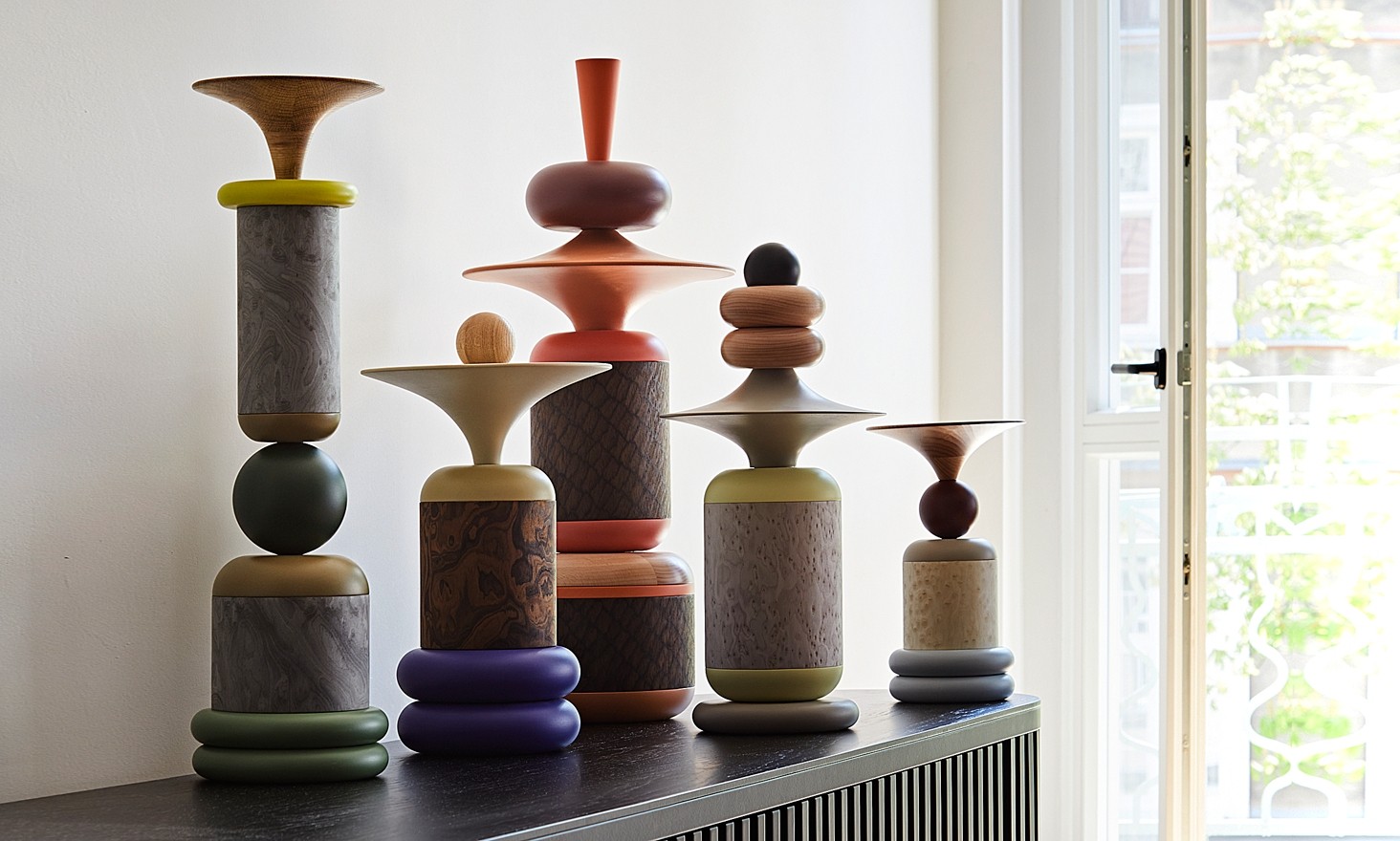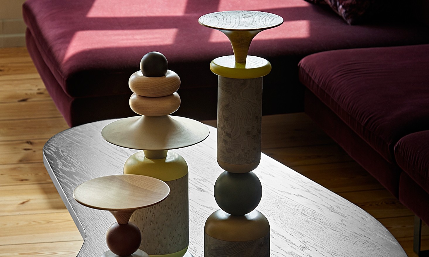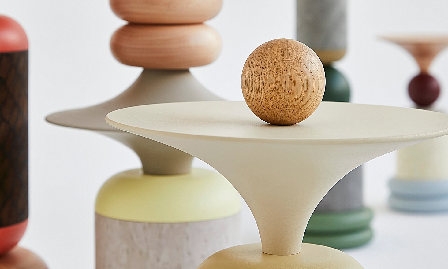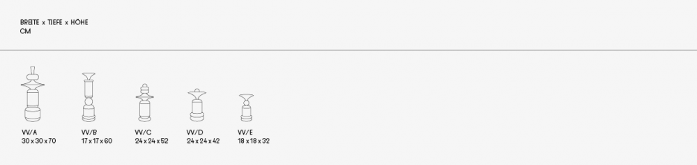 In den fünf Größen der einzelnen Totems findet sich ihr eigener, individueller Charakter wieder. Einerseits wird die wirbelnde Energie durch die Zylinder erreicht, die die Achse der Totems bilden, während die kunstvoll ausgeführten Formen des "Spinners" und der "Trompete" ihre massive Struktur visuell aufbrechen. Indem sie eine kreisförmige Bewegung ausstrahlen, unterstreichen sie die Rotationsbewegung der Drehbank, auf der sie entstanden sind. Andererseits bringen die Objekte durch ihre Farben Leben und Schwung in die Innenräume und schaffen spannende Blickpunkte mit Eigenschaften, die von ruhig und zurückhaltend bis hin zu energisch und temperamentvoll reichen.