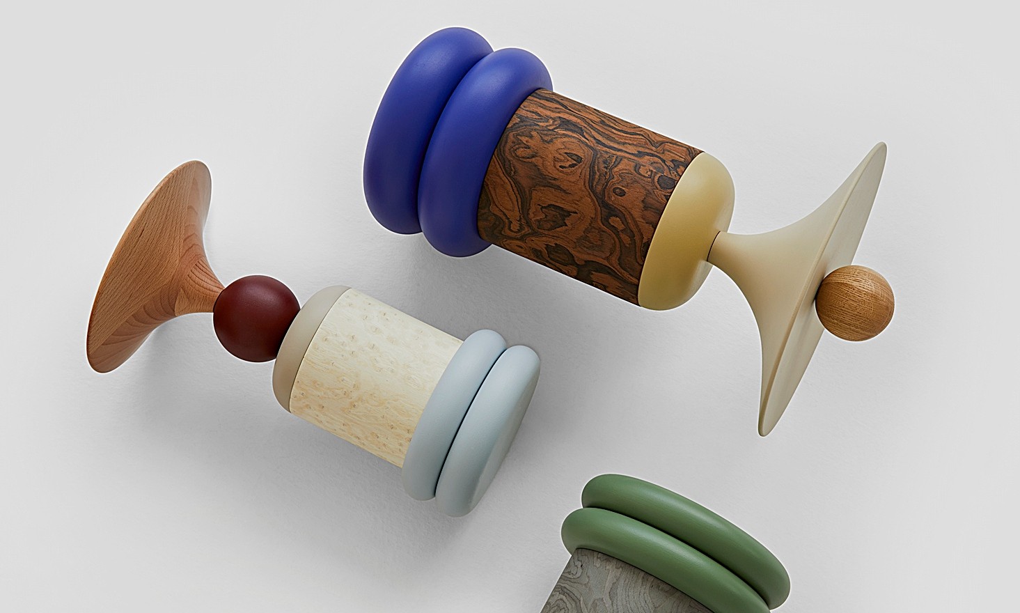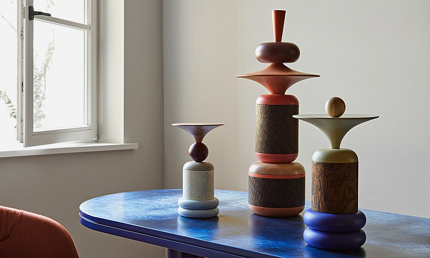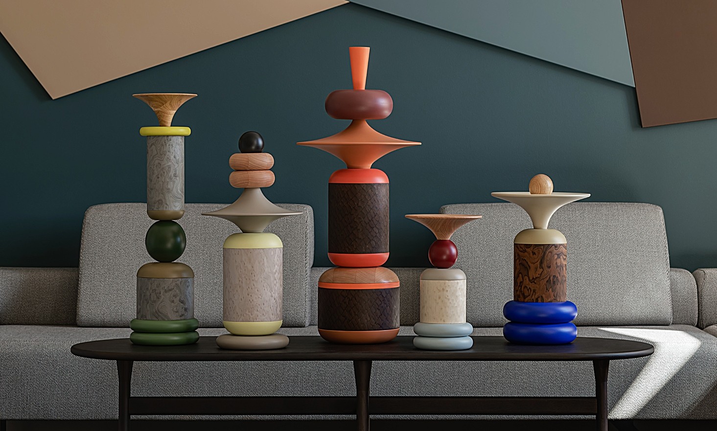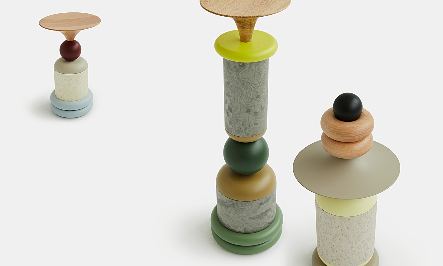 In den fünf Größen der einzelnen Totems findet sich ihr eigener, individueller Charakter wieder. Einerseits wird die wirbelnde Energie durch die Zylinder erreicht, die die Achse der Totems bilden, während die kunstvoll ausgeführten Formen des "Spinners" und der "Trompete" ihre massive Struktur visuell aufbrechen. Indem sie eine kreisförmige Bewegung ausstrahlen, unterstreichen sie die Rotationsbewegung der Drehbank, auf der sie entstanden sind. Andererseits bringen die Objekte durch ihre Farben Leben und Schwung in die Innenräume und schaffen spannende Blickpunkte mit Eigenschaften, die von ruhig und zurückhaltend bis hin zu energisch und temperamentvoll reichen.