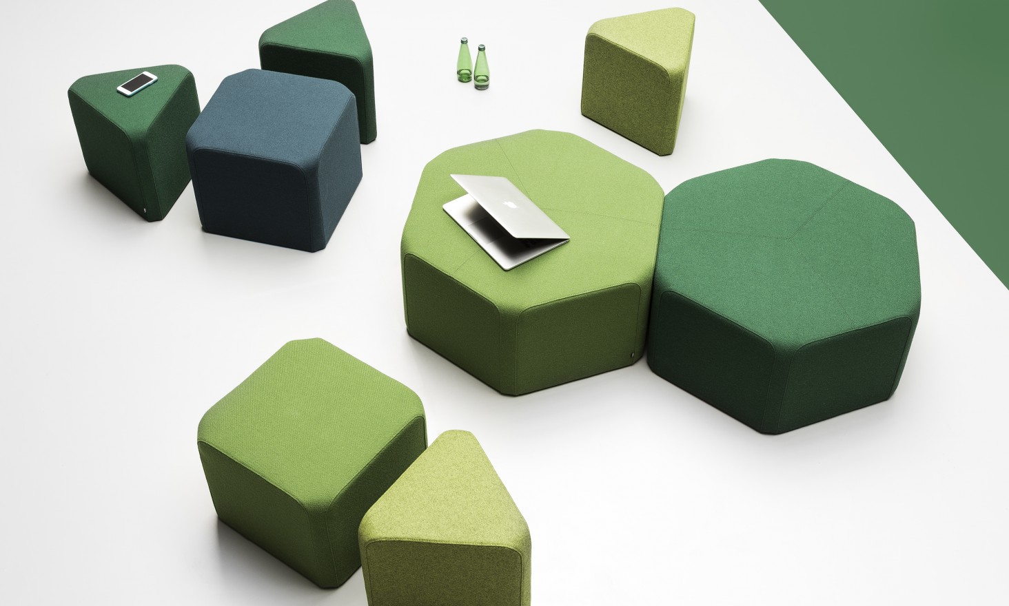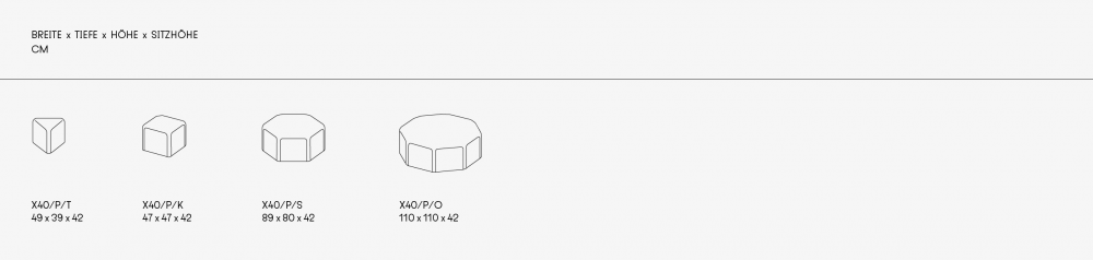 x40 ist eine Familie aus vier Polsterhockern mit polygonaler Basis in Form eines Dreiecks, Quadrats, Sechsecks und Achtecks.