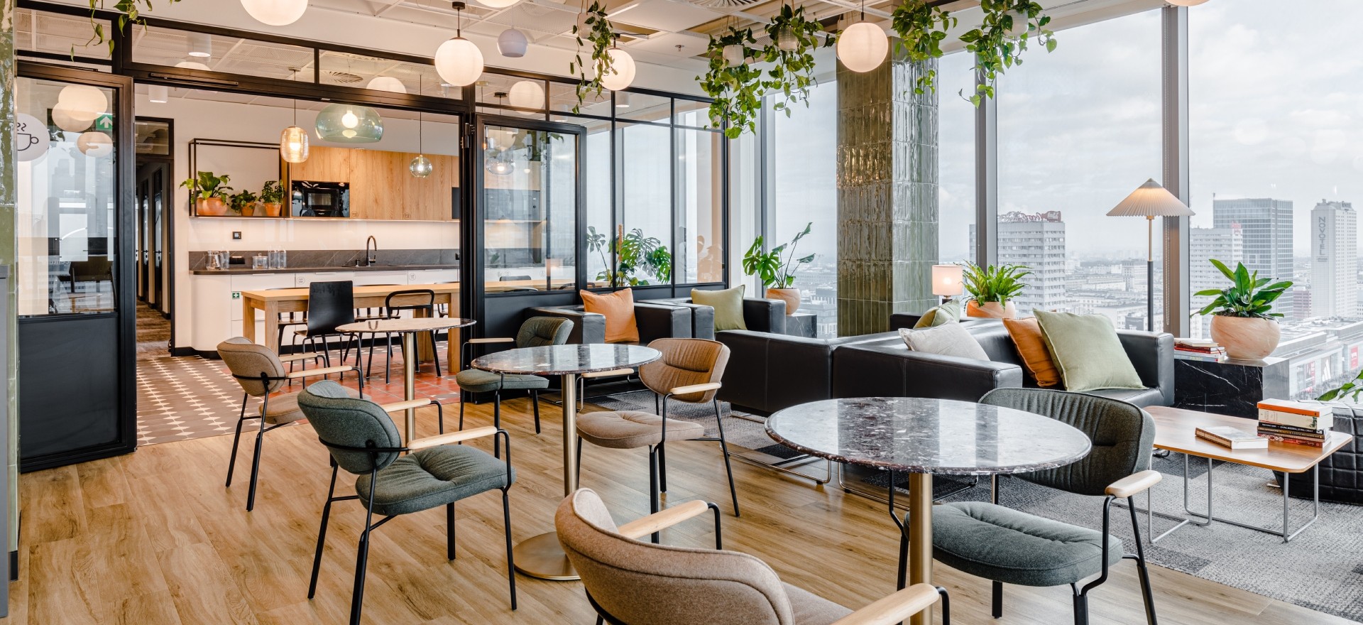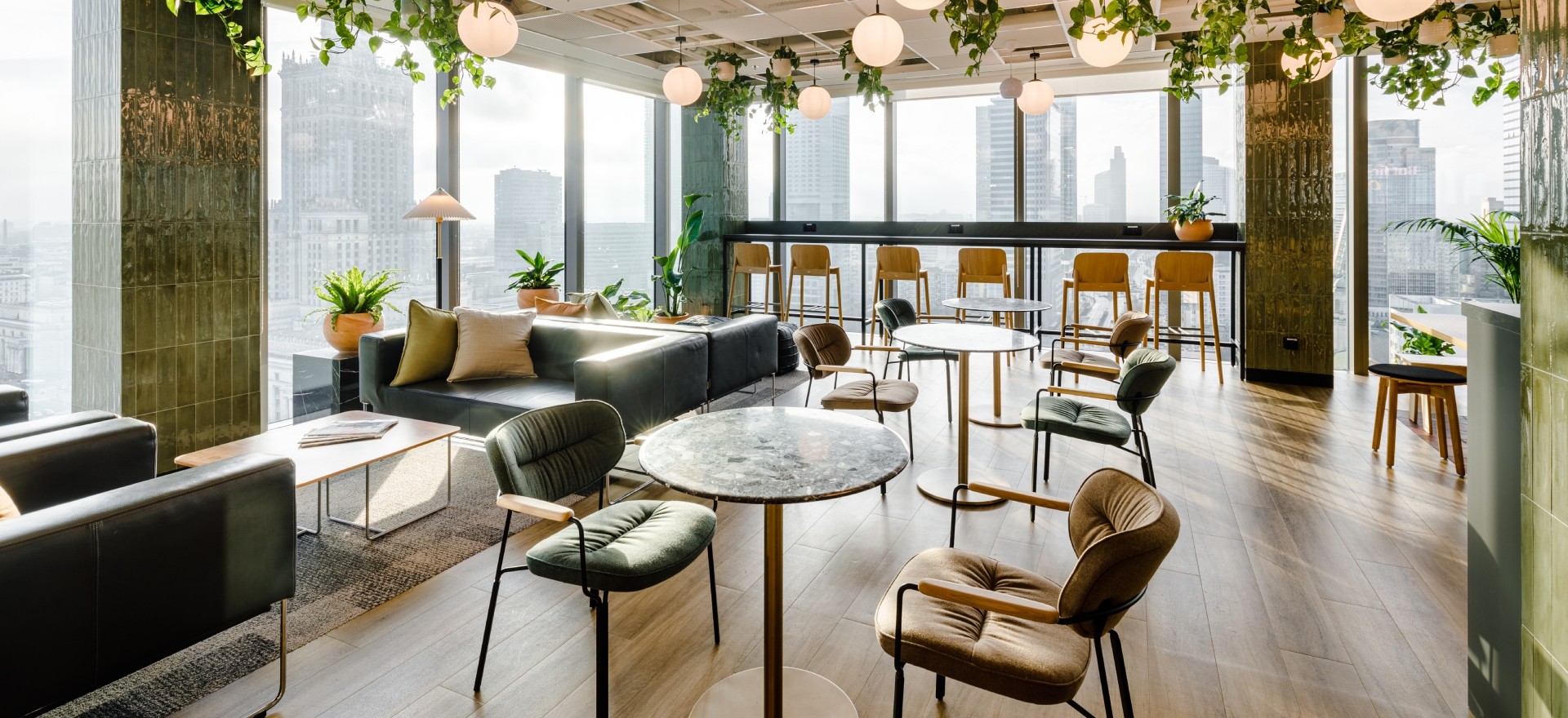 In den Innenräumen verwandelt sich der kühle Minimalismus der Kanzlei in einen freundlichen, komfortablen, offenen Tagungsraum mit einem beeindruckenden Blick auf die Warschauer Skyline.