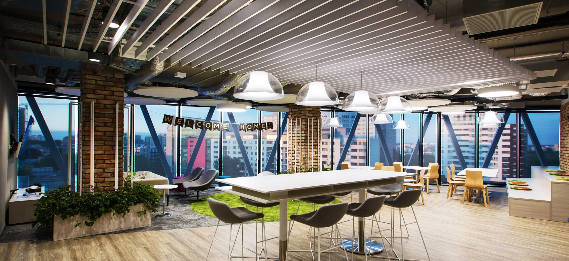 Der gesamte Büroraum mit einer Fläche von 2,7 Tsd. Quadratmetern, der vom Atelier Bit Creative von Barnaba Grzelecki entworfen wurde, wurde durch Salon Balma Warszawa mit Hockern, kleinen Tischen, Sesseln Mishell mit Gleitern und mit Tellerfuß, Stühlen Linar Plus auf Holzbeinen, einem Sofa und dem Kaffeetisch Teddy Bear, dem Nebentisch Rosco sowie Sesseln Manta Lounge und Club ausgestattet.