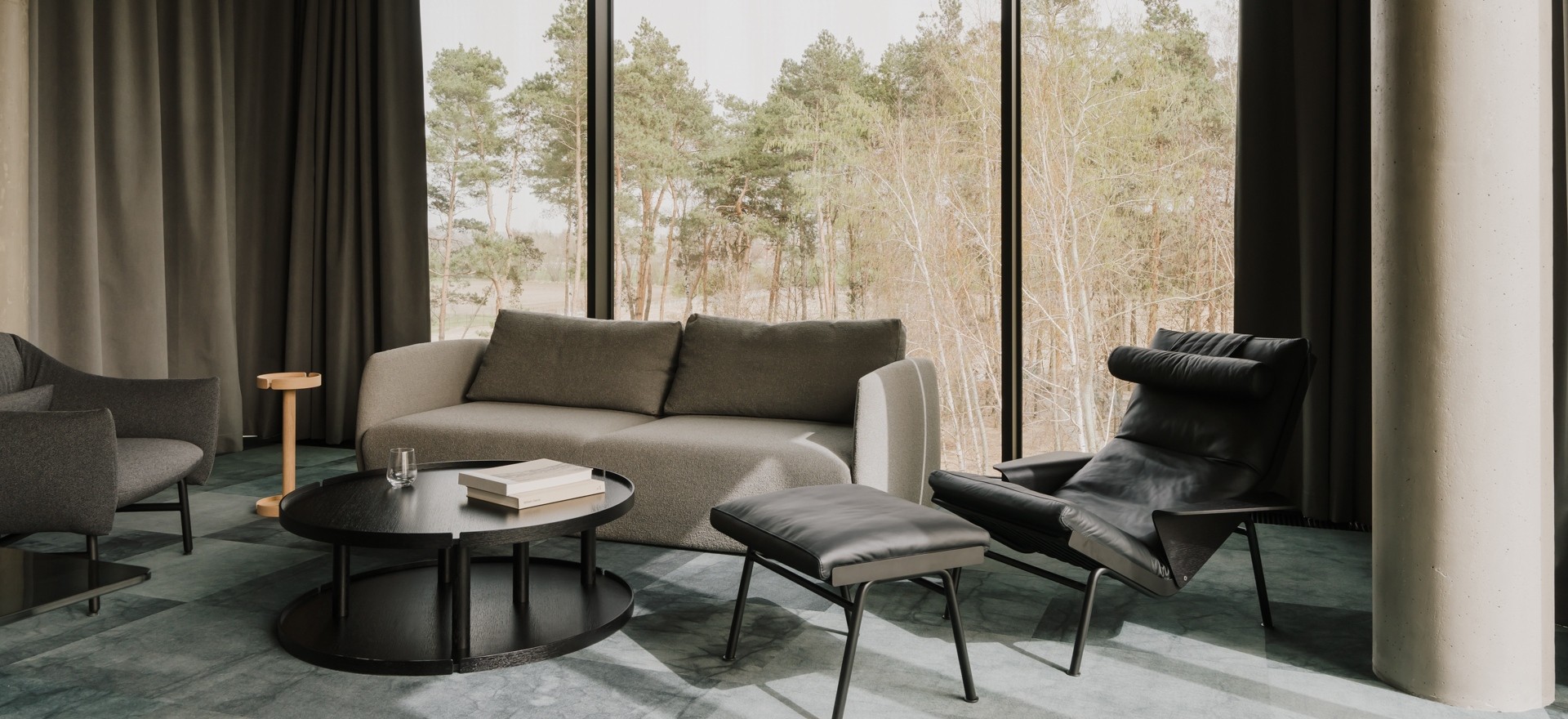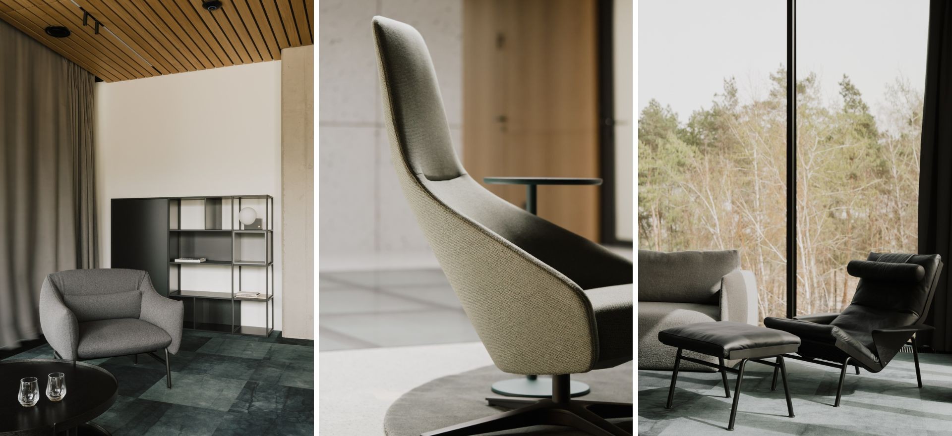 Die CEO-Zimmer sind Räume, die sowohl einen schönen Blick auf den Wald als auch akustischen Komfort und Ruhe bieten. Dafür sorgen die hier verwendeten Gestaltungselemente: Eichendecke, schwere Vorhänge, Teppichboden und Möbel - alles in einer neutralen, natürlichen Farbpalette gehalten. Brauntöne, Schwarz und Grau geben hier den Ton an. Der Ronin-Sessel, die Sessel aus den Kollektionen Lua und Mishell soft sowie die Serif-Tische fügen sich perfekt in das Konzept des Posener Studios Oda ein.