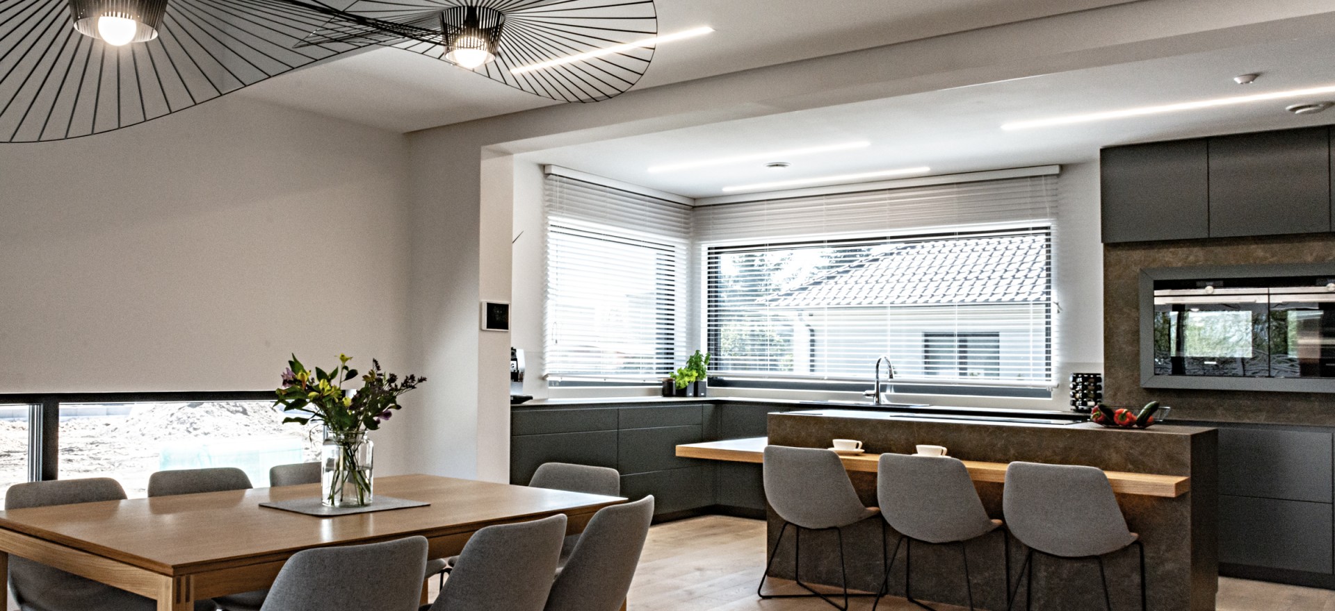 Das Erdgeschoss des Hauses verbindet in sich zahlreiche Funktionen. Der Bereich des Wohnzimmers, Esszimmern und der Küche sowie der Blick auf die Whisky-Bar im Zwischengeschoss durchdringen einander und stellen den repräsentativen Teil des Hauses für die Gastgeber und deren Gäste dar.