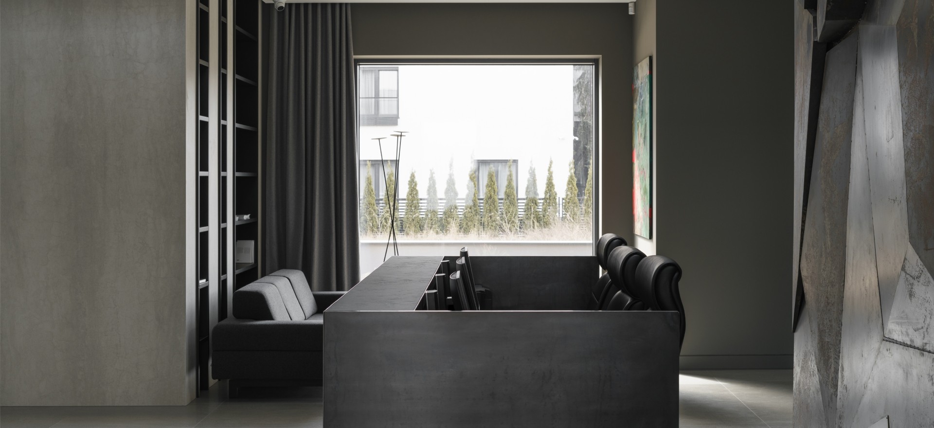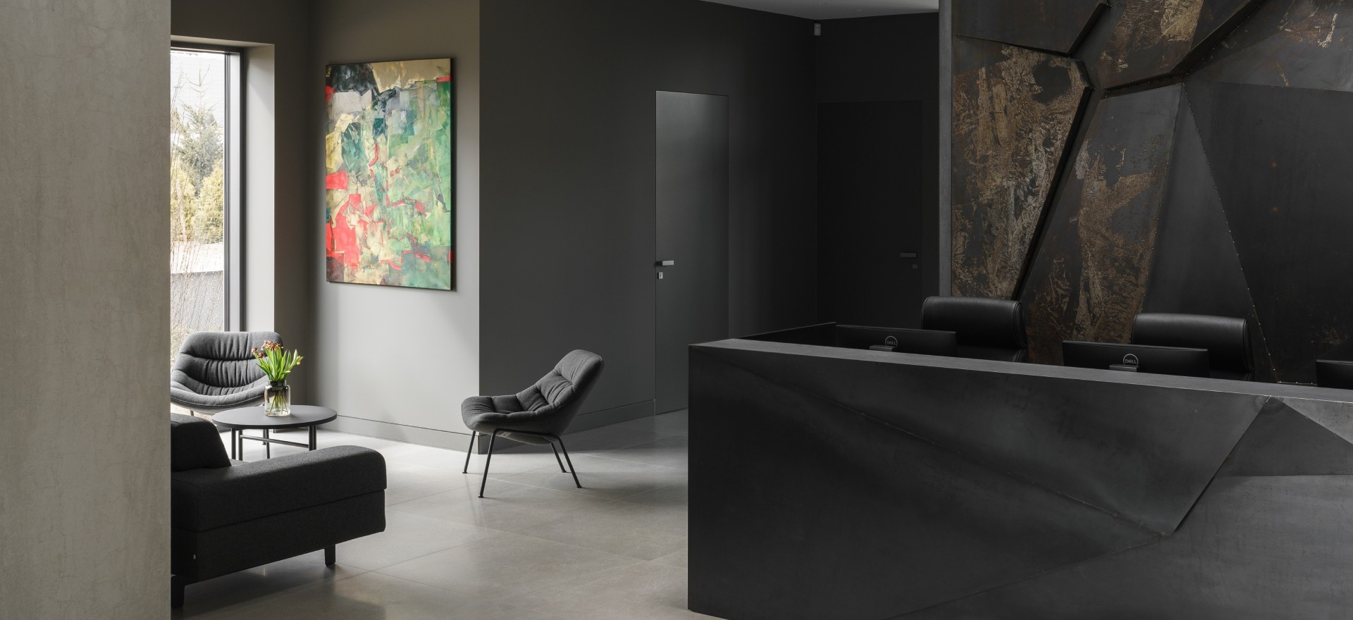 Da die ausdrucksstarke Skulptur diesen Raum dominiert, musste der Rest des Innenraums beruhigt und die Anzahl der Reize reduziert werden. Dieser Effekt wurde durch eine gedämpfte Farbgebung mit Grafit, Schwarz und Braun erreicht. Die Materialien wurden sorgsam ausgewählt, die Beleuchtung und die Möbel sorgfältig geplant, um dem Personal und den Patienten ein Gefühl von Harmonie und Komfort zu vermitteln.