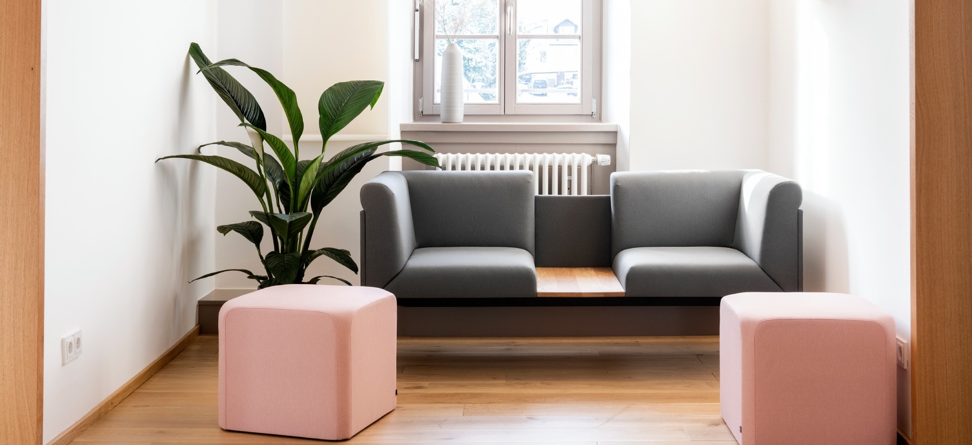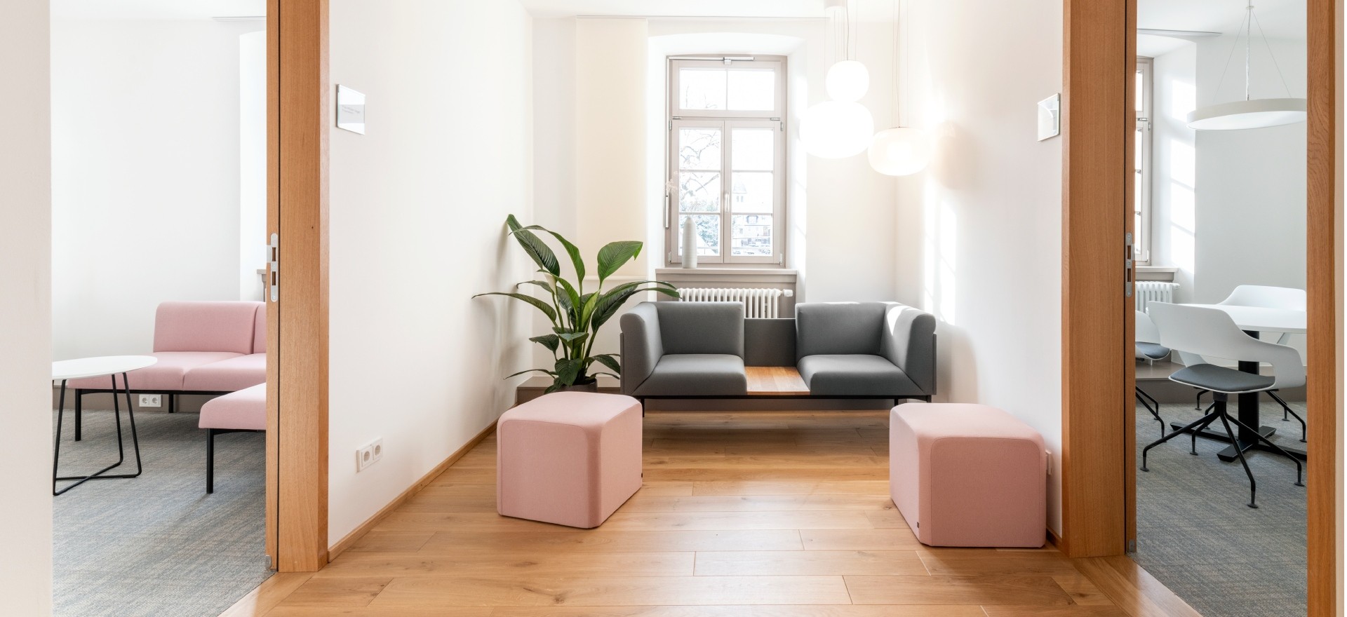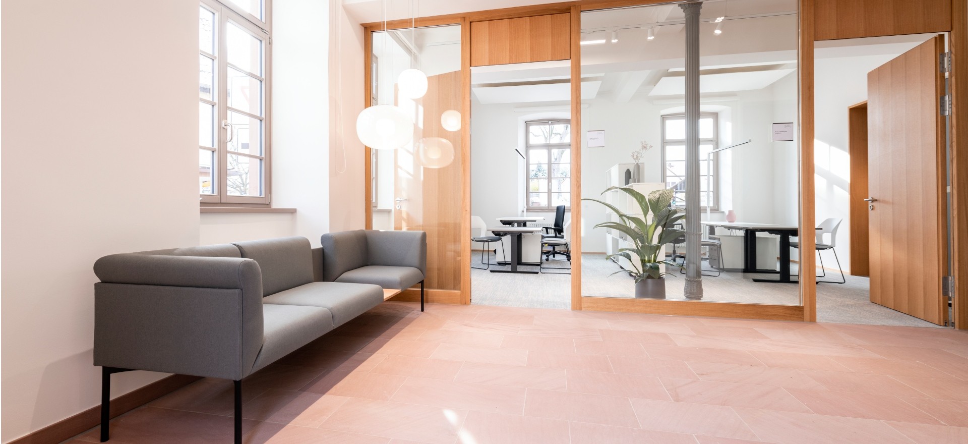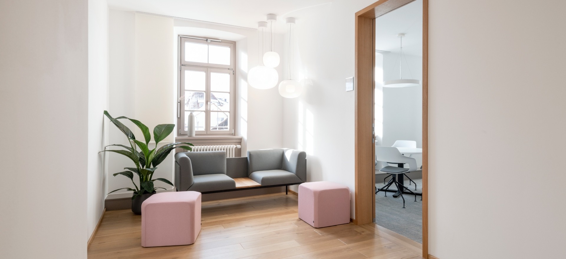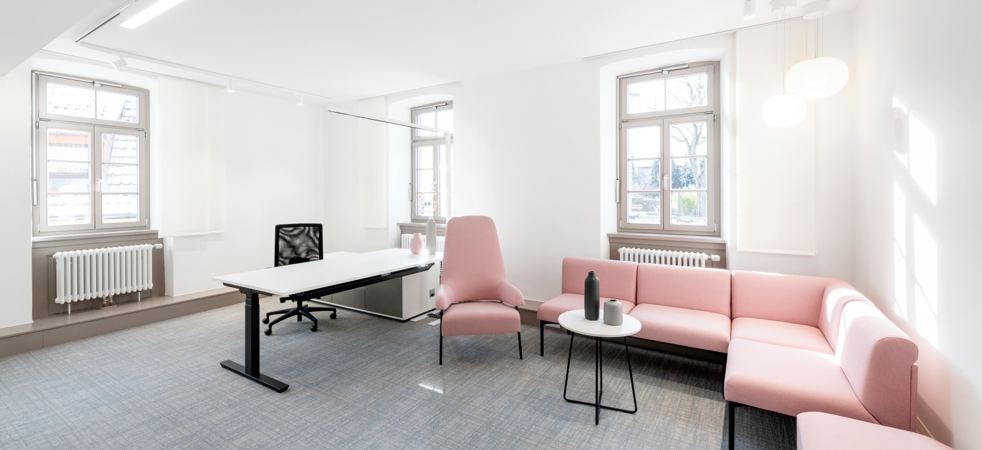 Die erneuerten Holzelemente des alten Gebäudes und die in hellen Pastelltönen gehaltenen Büroräume schaffen eine freundliche Atmosphäre. Für die Realisierung wurden Noti-Möbel aus den Kollektionen Sona, Gap und x40 verwendet.