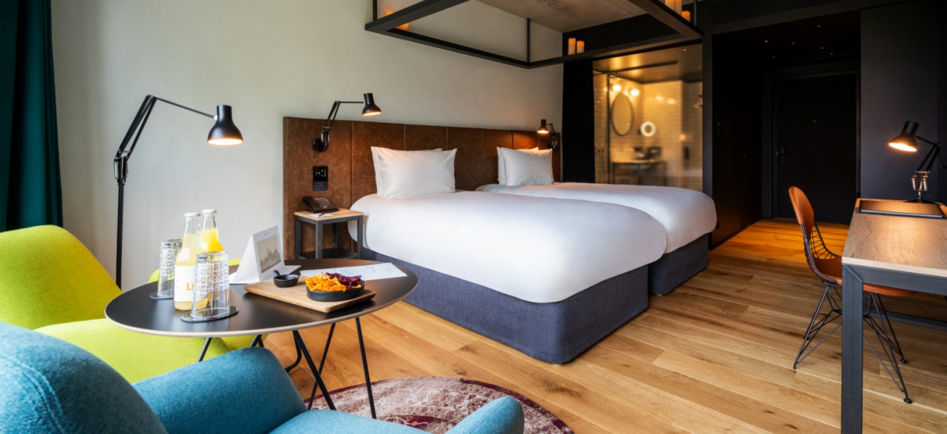 Das sechsgeschossige Hotel bietet 184 Zimmer sowie Konferenzsäle, einen Ballsaal, Garagen und eine Dachterrasse. In den Zimmern wurden Möbel der Marke Noti aus der Kollektion Manta verwendet. Diese finden wir ebenfalls in der Hotellobby.