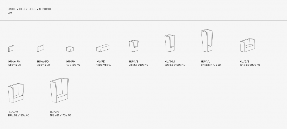 Hussar is a family of seating solutions consisting of a couch, an armchair, a pouffe, and a table.