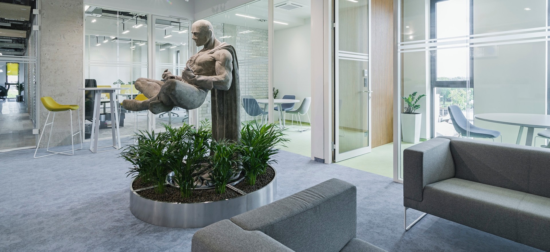 Visitors are immediately welcomed by an unusual yet powerful figure waiting at the reception: a levitating sculpture of an IT superhero.