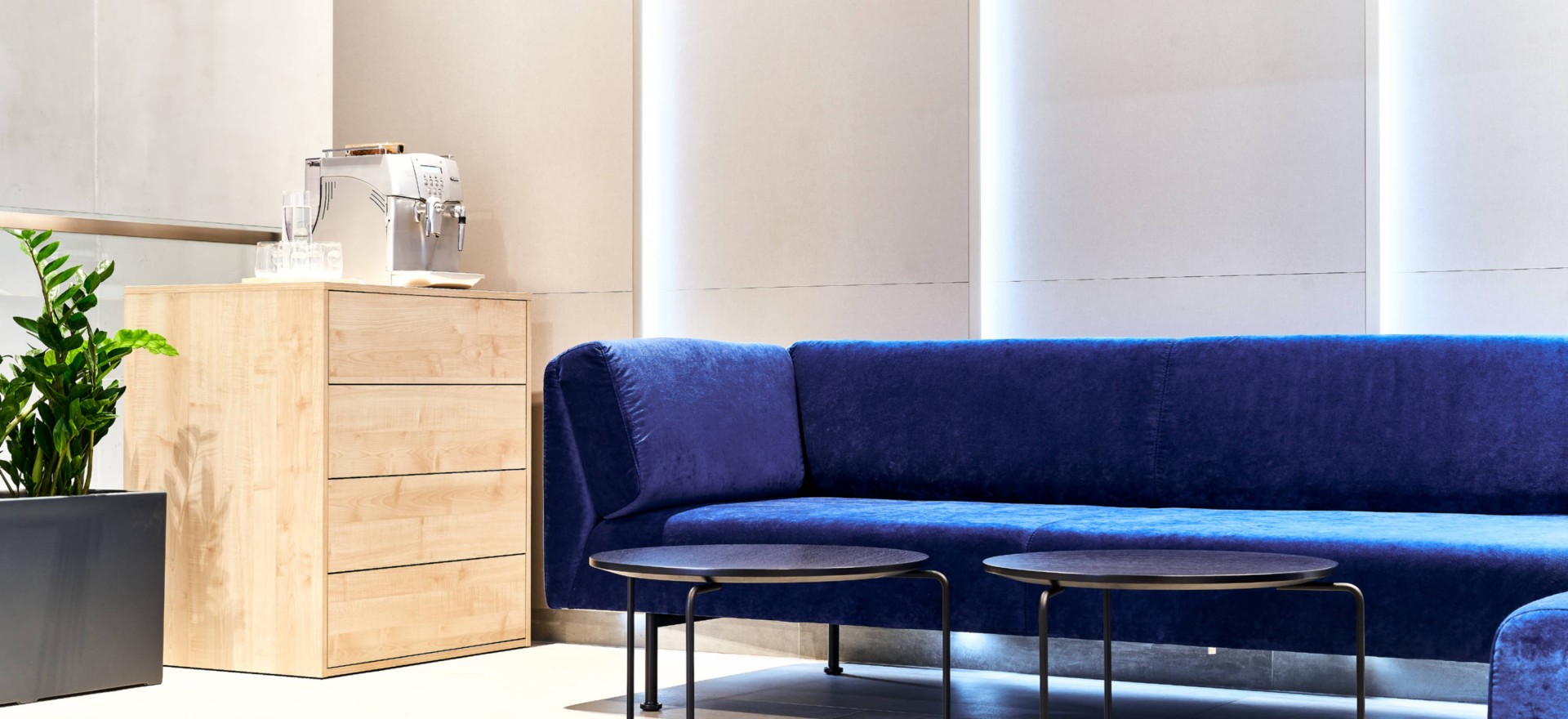 In the waiting area in the main hall, visitors can take a seat on sofas from our Muse collection designed by Piotr Kuchciński. The seating solutions are accompanied by small black Tritos coffee tables.