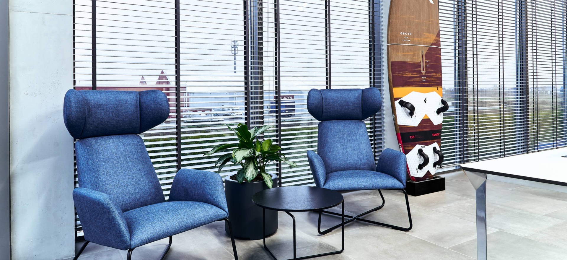 The CEO's office has been equipped with comfortable Manta armchairs. The colour of the furniture – deep blue – bring to mind water and sky.