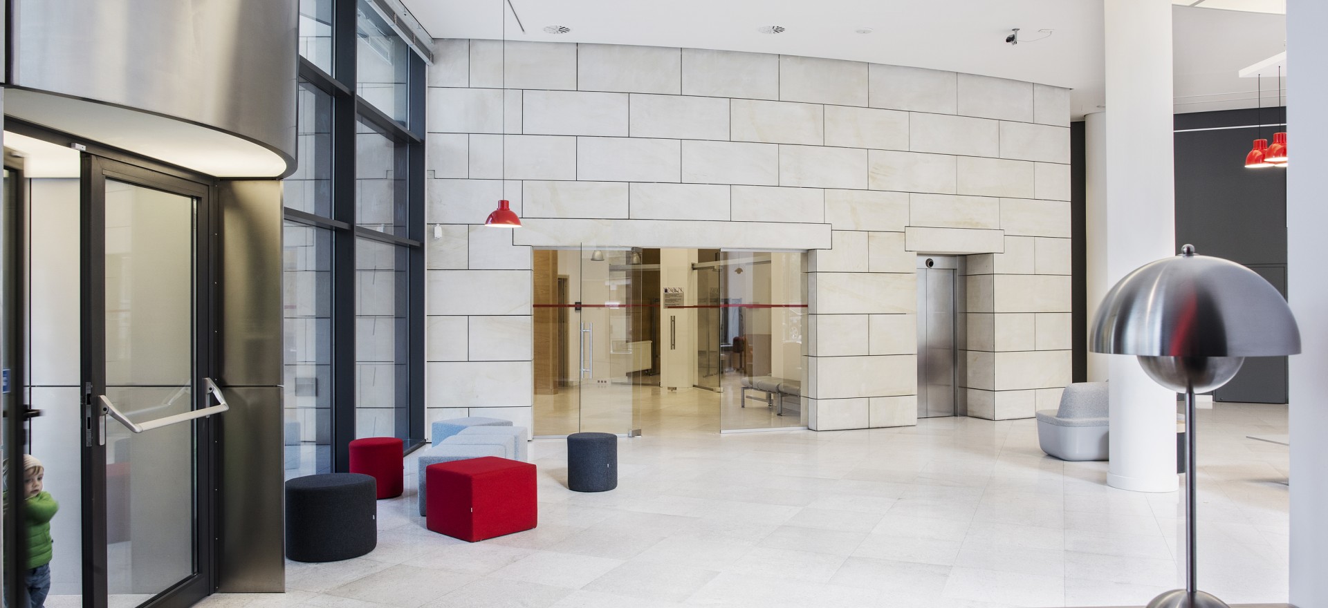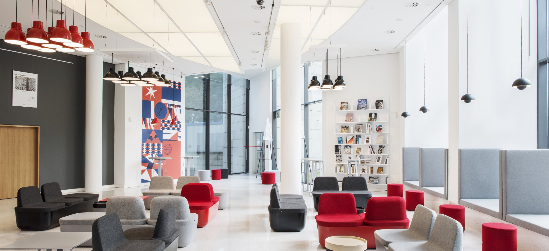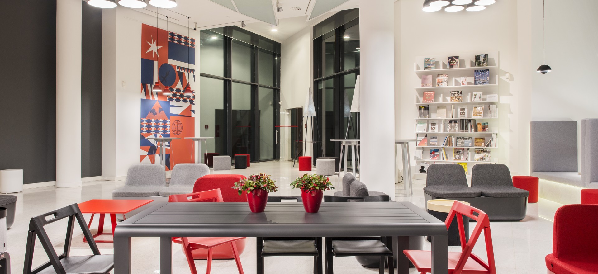 The design of the entrance hall of the Museum, created by designers from AOS Studio Architecture in collaboration with Agata Karolczuk and Jakub Napolski, features a colour palette which has been limited to shades of grey and white. The monotone is interrupted by strong red accents. The result is a spacious, modern, graphic venue.