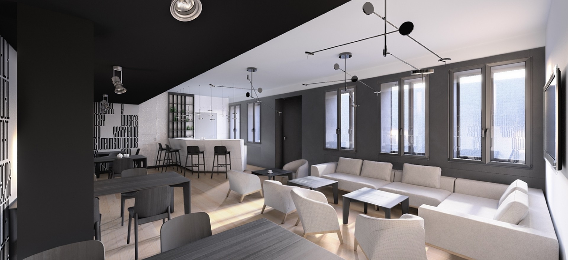 The central goal was to ensure consistency with the overall architectural character of the building. Inspirations included the graphic qualities of text, the texture of paper, and the subtle elegance evoked by black and white combinations.