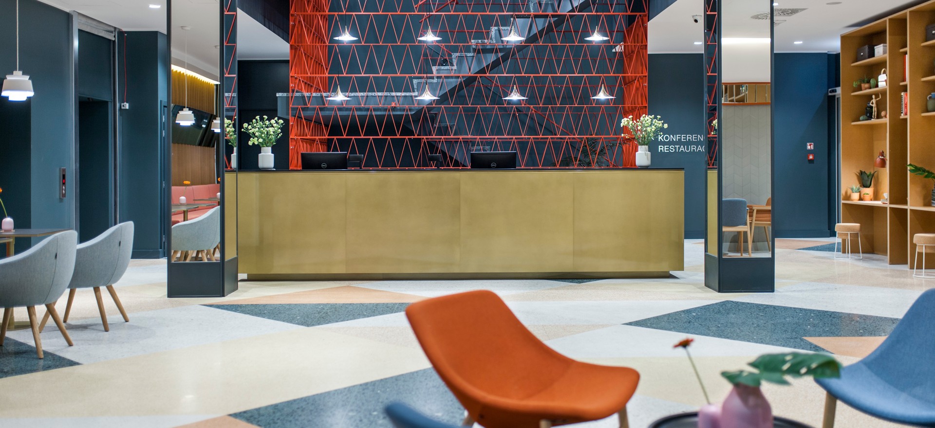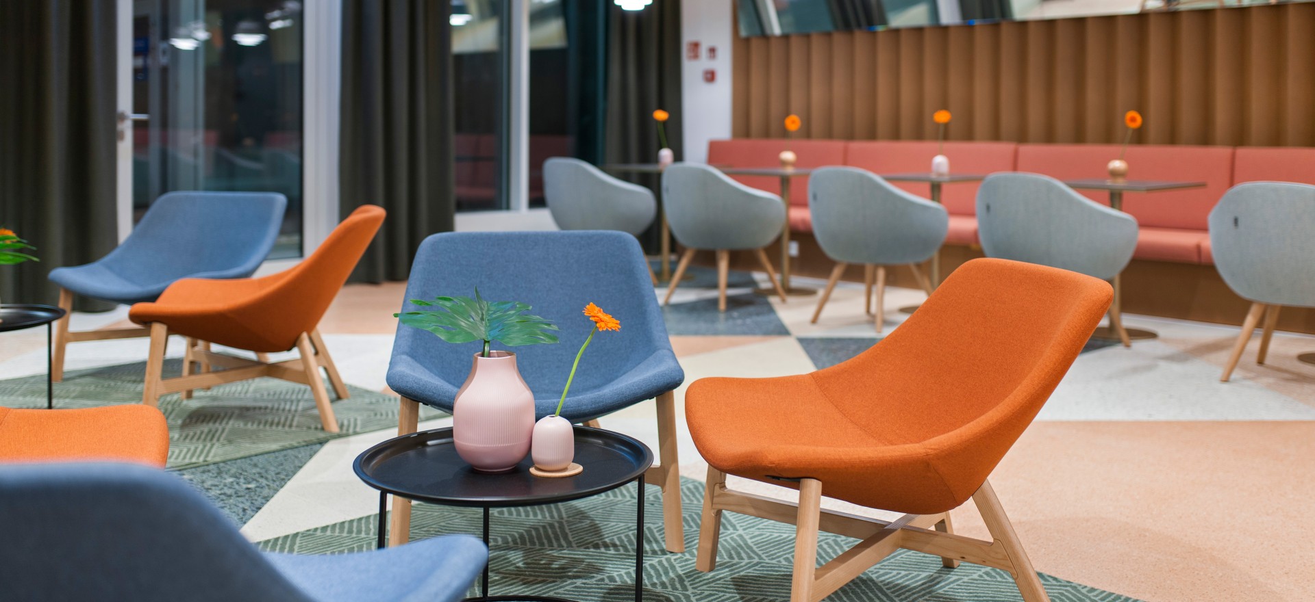 Contemporary modernist interiors provide a perfect setting for working and relaxing. The past era can be traced in details, colours and patterns. The spacious lobby, decorated in warm colours, has been furnished with Mishell armchairs on wooden bases. Their colours – orange and dark blue – are a reference to the original ceramic tiles. The décor combines the best of modernist design trends which still appear fresh and up-to-date.