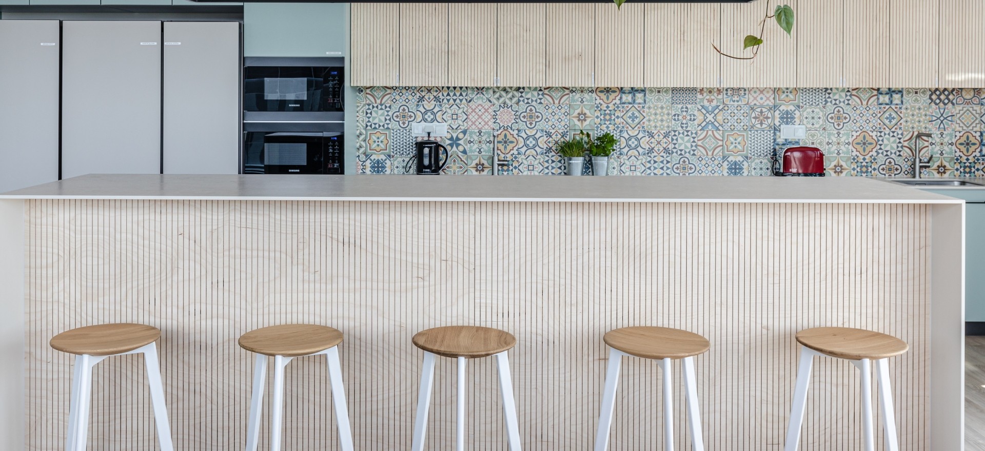 Care was taken to ensure space for individual work, inspiring talks, meetings and conferences. The kitchenette with a long dining table and an equally long kitchen island is the hot-spot of social life, where meals can be had together. In fact, they can also be prepared together, because the kitchenette is fully equipped – there is even an oven!