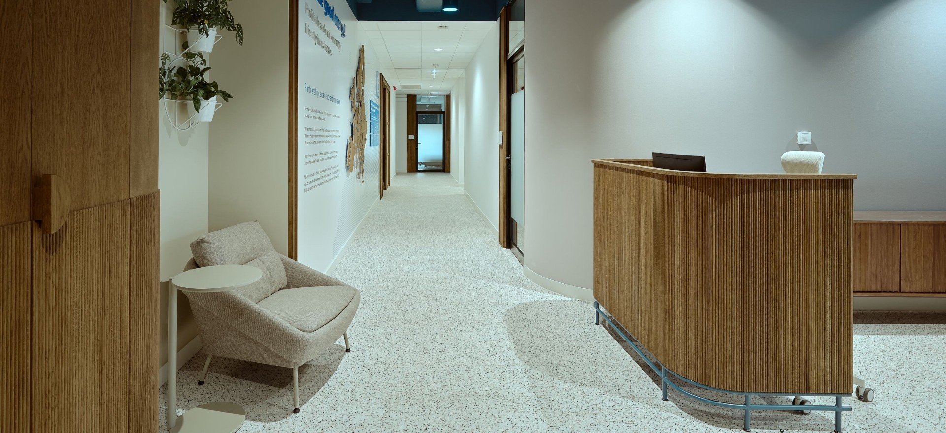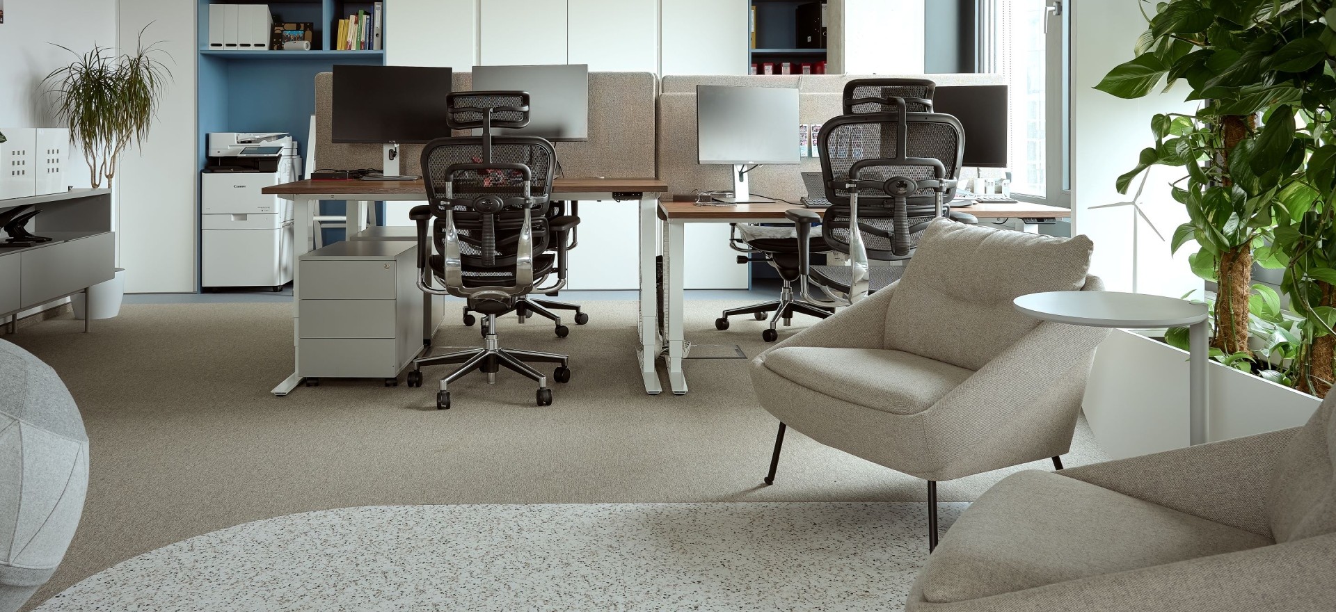 The colour palette is inspired by the world of nature and by the brand's visual identity. Wood, abundance of plants and toned down colours create a people-friendly working environment.