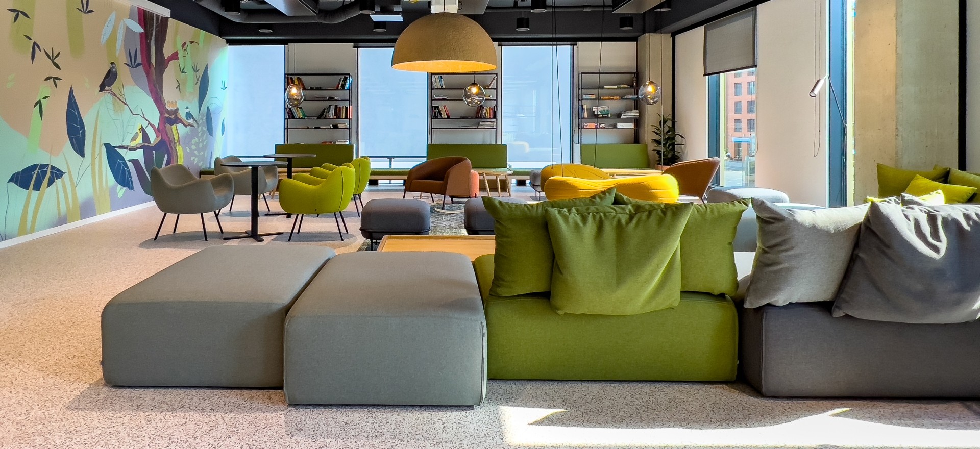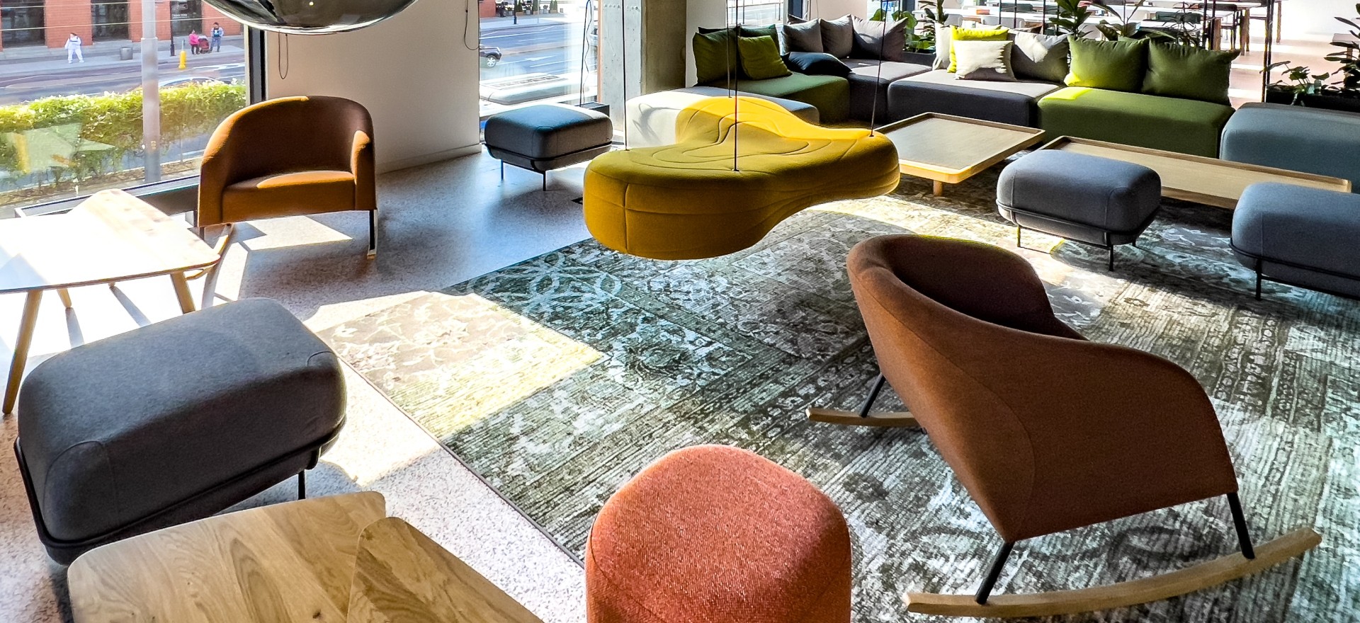 The design combines animal motifs and colours inspired by nature. The same principle applies to furniture, including that from Noti. Employees can relax on Le Monde sofas, a Bouli swing, and a Mula cantilever armchair.