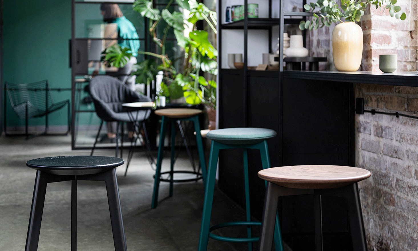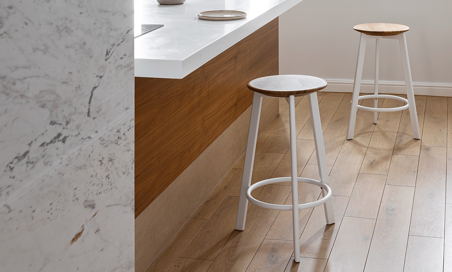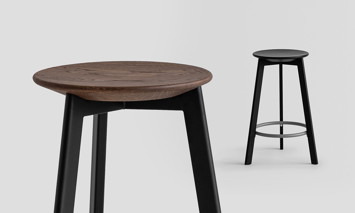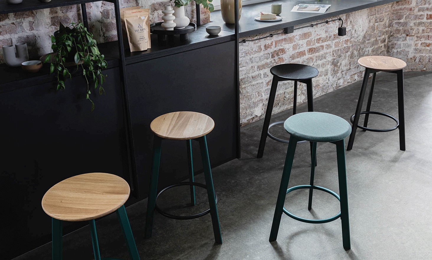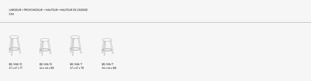 Les tabourets sont disponibles en deux hauteurs. Leur assise confortable et galbée est disponible en version dure (chêne massif) ou souple (rembourrée).