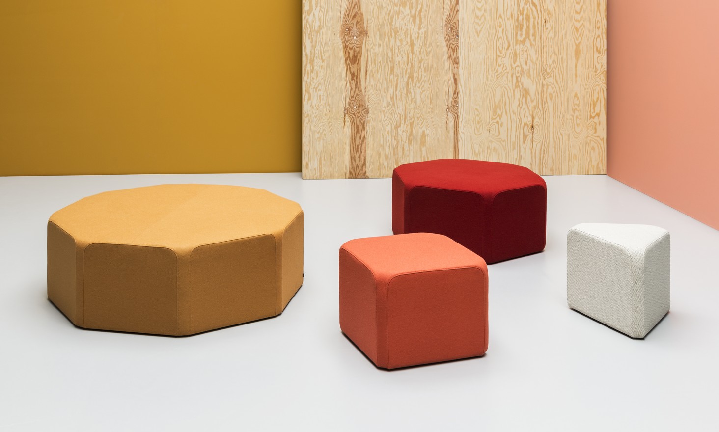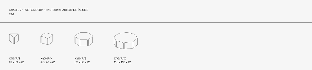 x40 est une famille de quatre poufs à base polygonale, sur un plan triangulaire, carré, hexagonal ou octogonal.