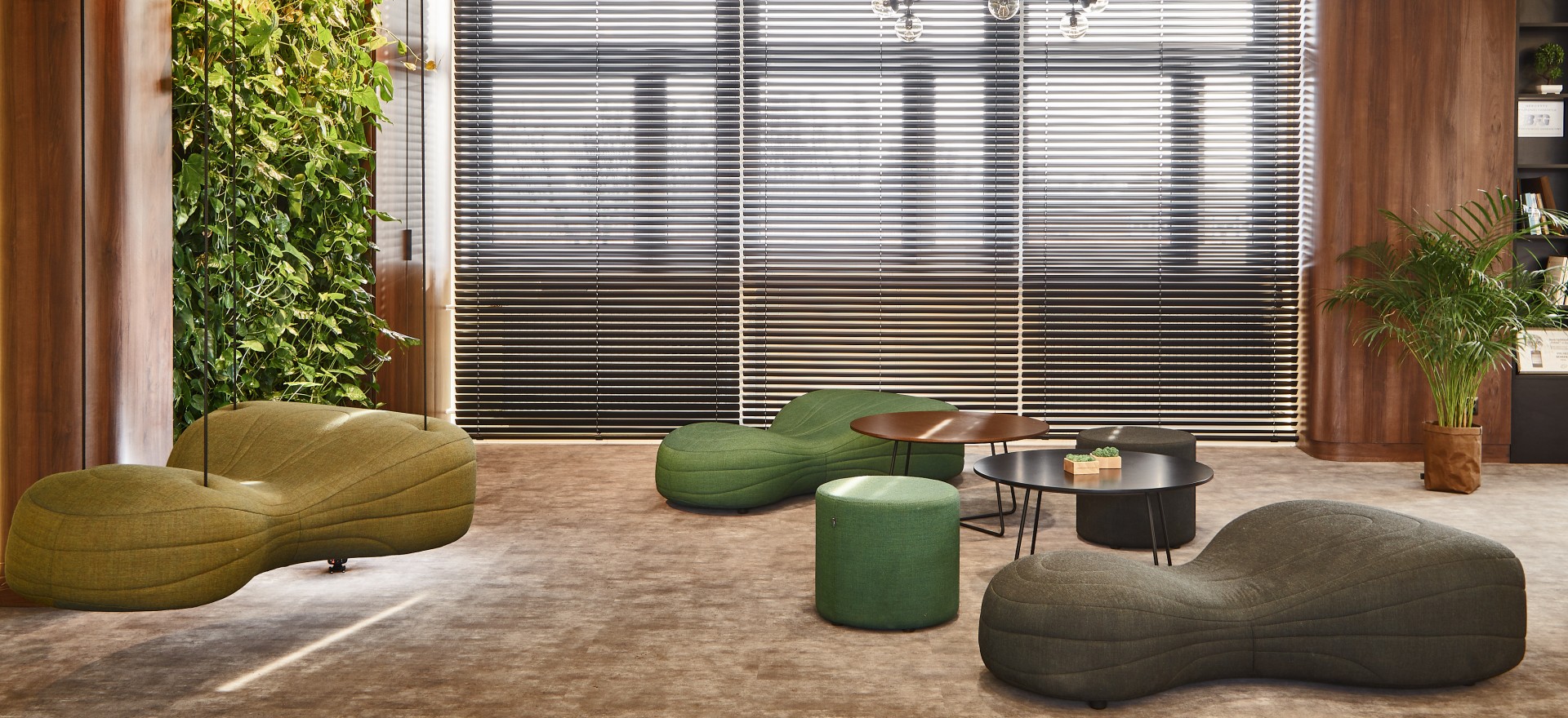 La décoration intérieure s'inspire de la nature, tant par le choix des couleurs que par les formes organiques du mobilier et les détails décoratifs : ici, c’est l’épi de blé, caractéristique de la région. Le plancher, quant à lui, raconte l'histoire de la banque en s'arrêtant sur les dates les plus significatives.