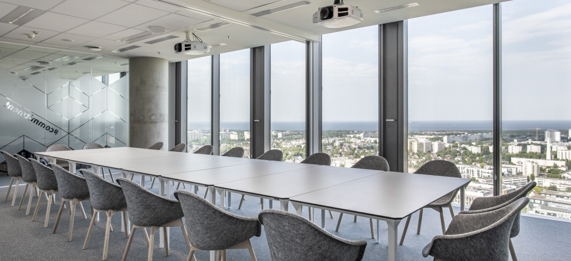 Les chaises Mamu en feutre gris clair sur des pieds en bois naturel ont été utilisées pour ce projet de bureaux de plus de 5 200 m2 pour 500 personnes, dans l'immeuble de bureaux Olivia Star à Gdansk.