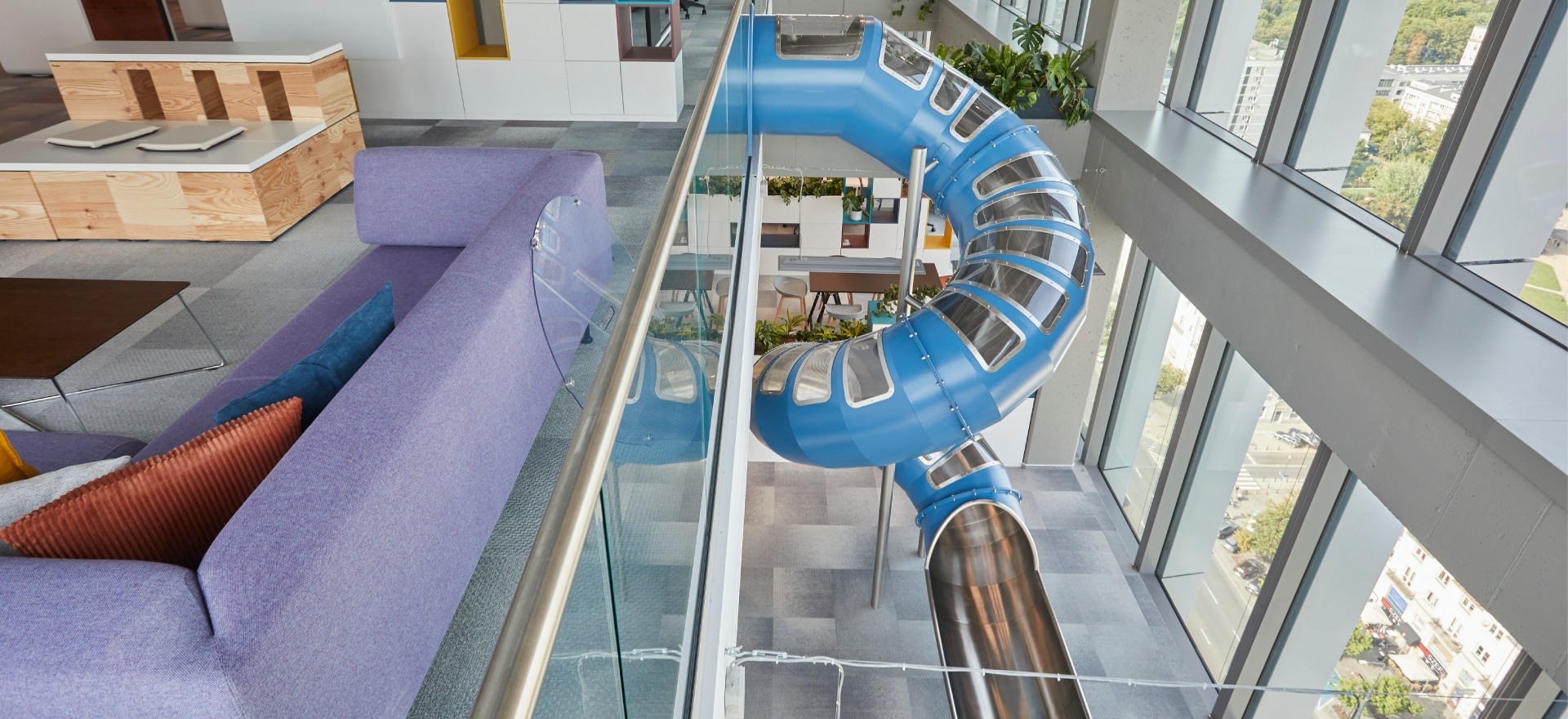 L'ensemble bénéficie d’une excellente localisation : aux 21ème et 22ème étage du gratte-ciel Central Point, avec une vue magnifique sur Varsovie. Un peu de folie au travail ? Pourquoi pas ? Les deux étages sont reliés par un toboggan pour les employés. Ici, le ton est à la joie, à l'enthousiasme et à l'énergie.