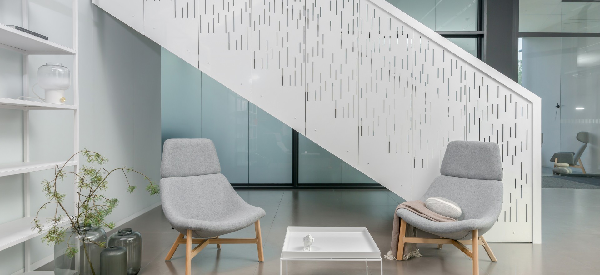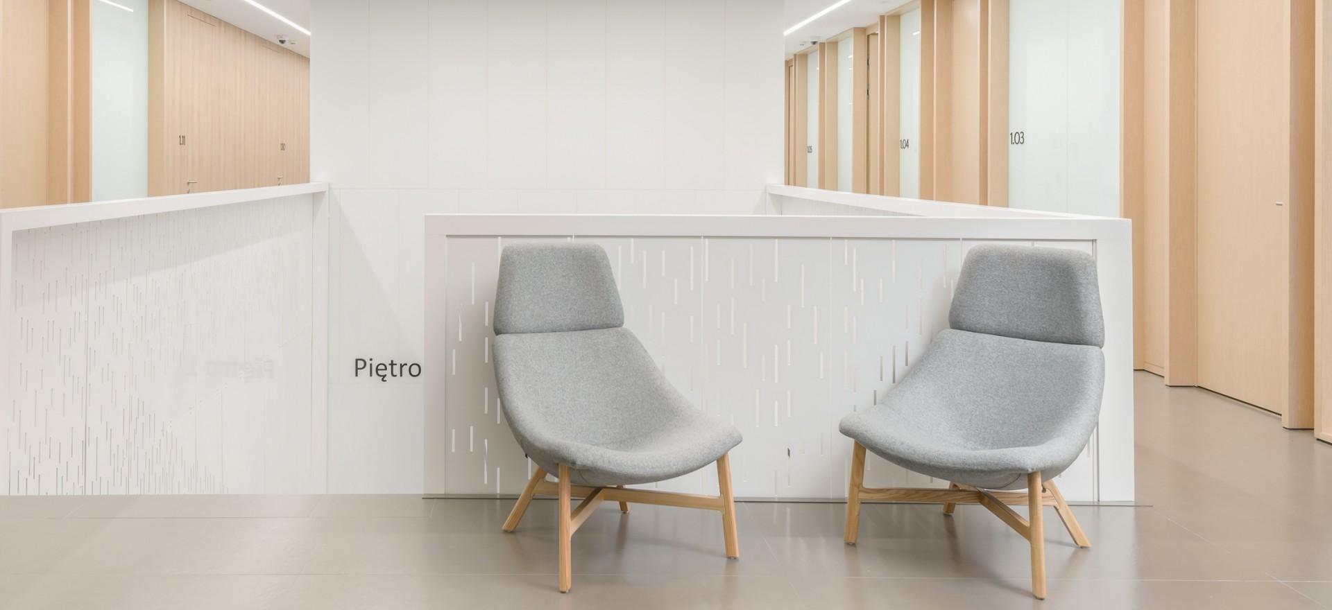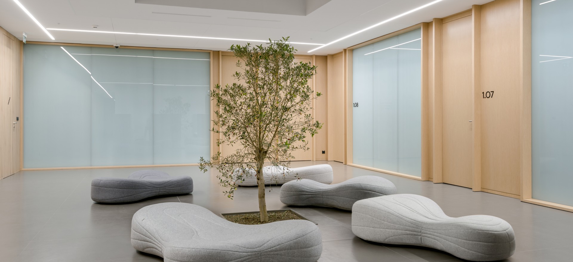 Les intérieurs des bureaux sont spacieux et lumineux. Le mobilier utilisé pour leur aménagement comprend des meubles Balma et NOTI.