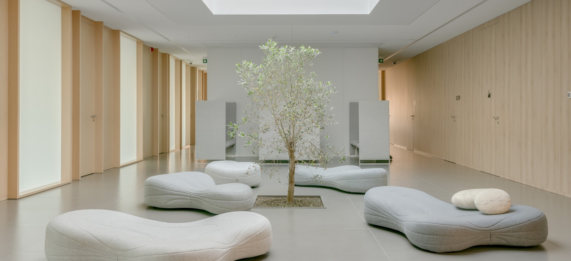 On y trouve des fauteuils Manta et Mishell XL sur pieds en bois, tandis que le grand espace du hall de l'étage est occupé par des sièges Bouli.