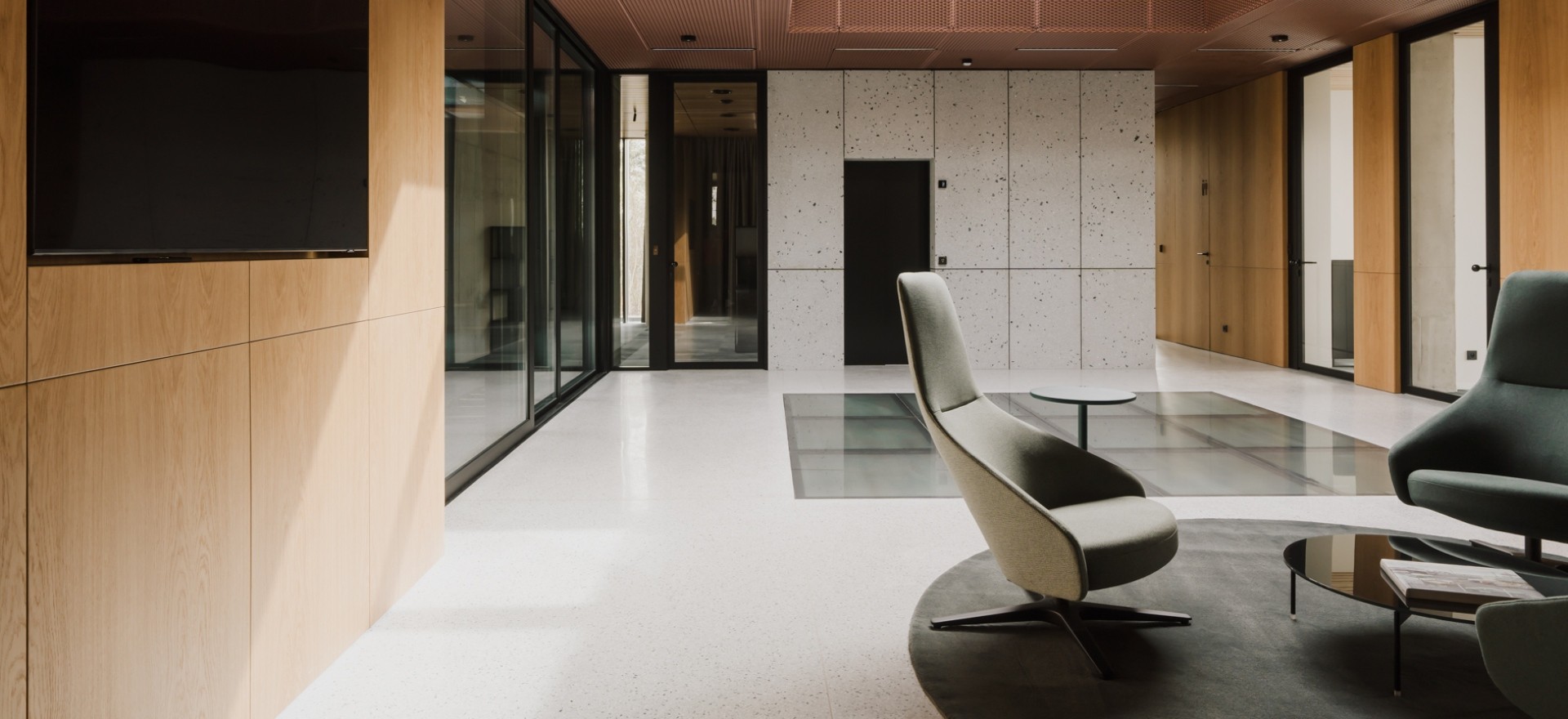 Son lobby spacieux est éclairé par une lucarne, et la lumière entrante se réverbère dans le plancher vitré. Les fauteuils Palo invitent à la détente. Dans les bureaux aux couleurs sobres on retrouve des chaises de la collection Mishell et Eke.