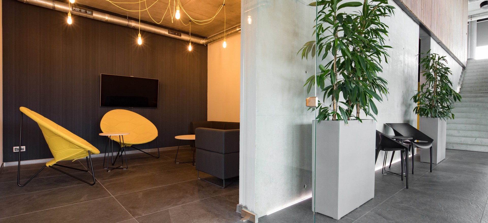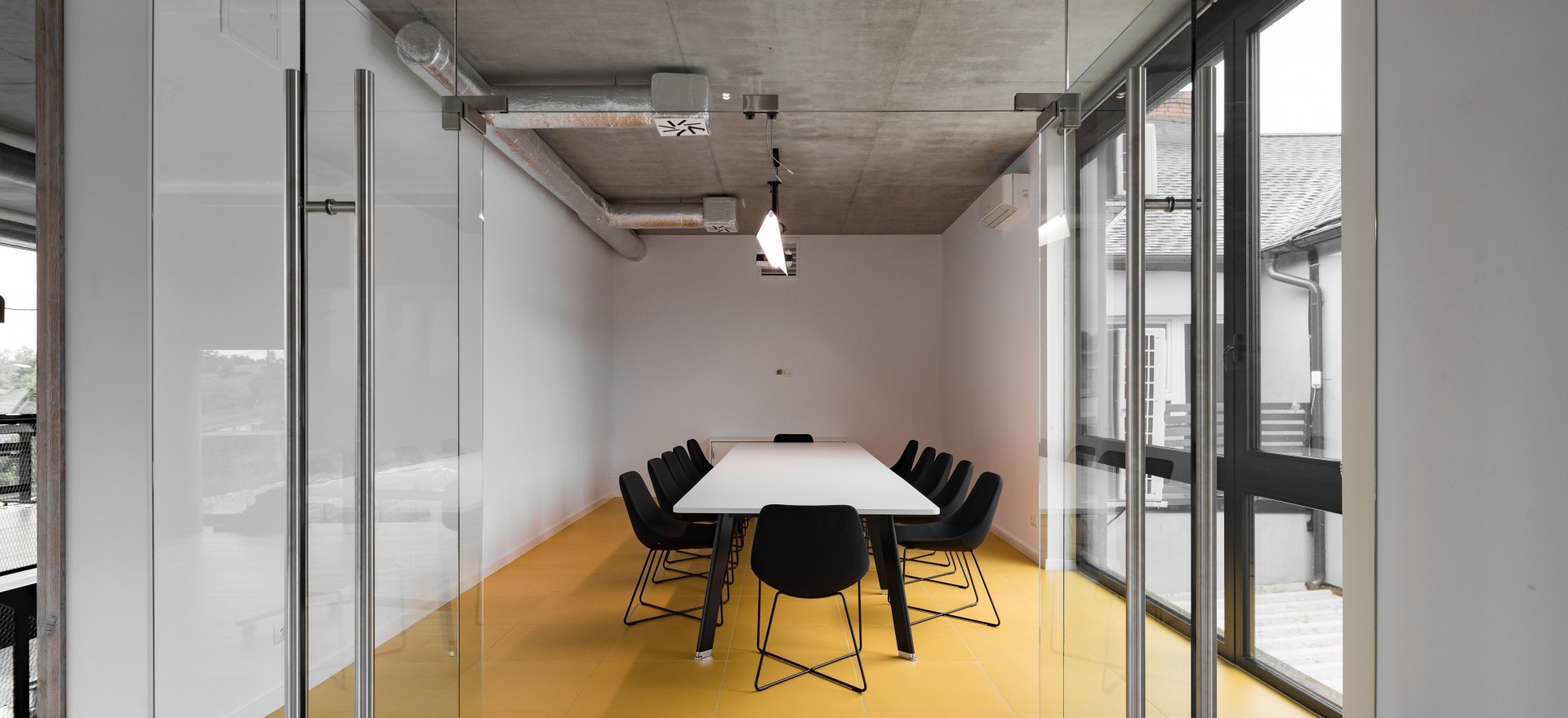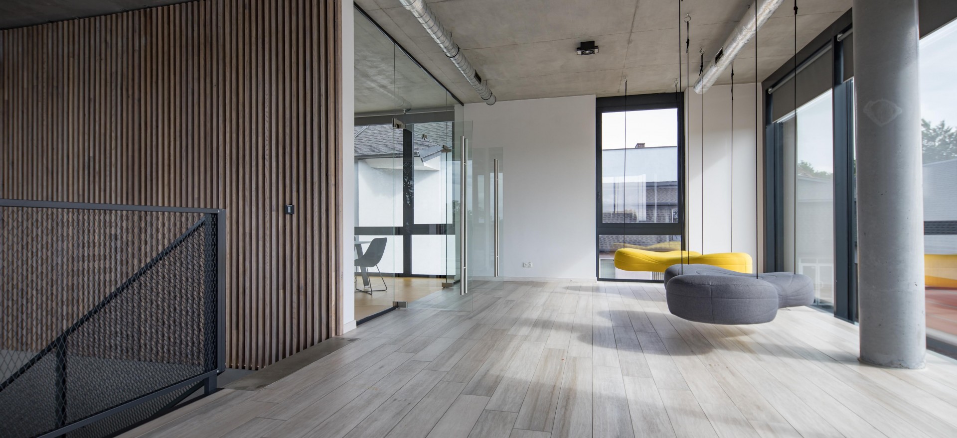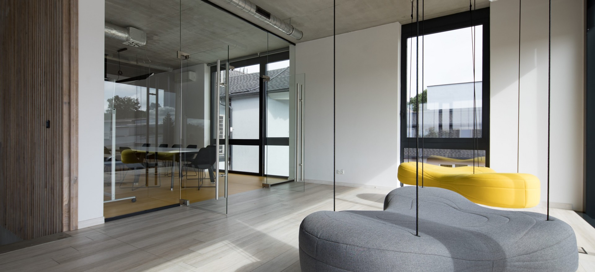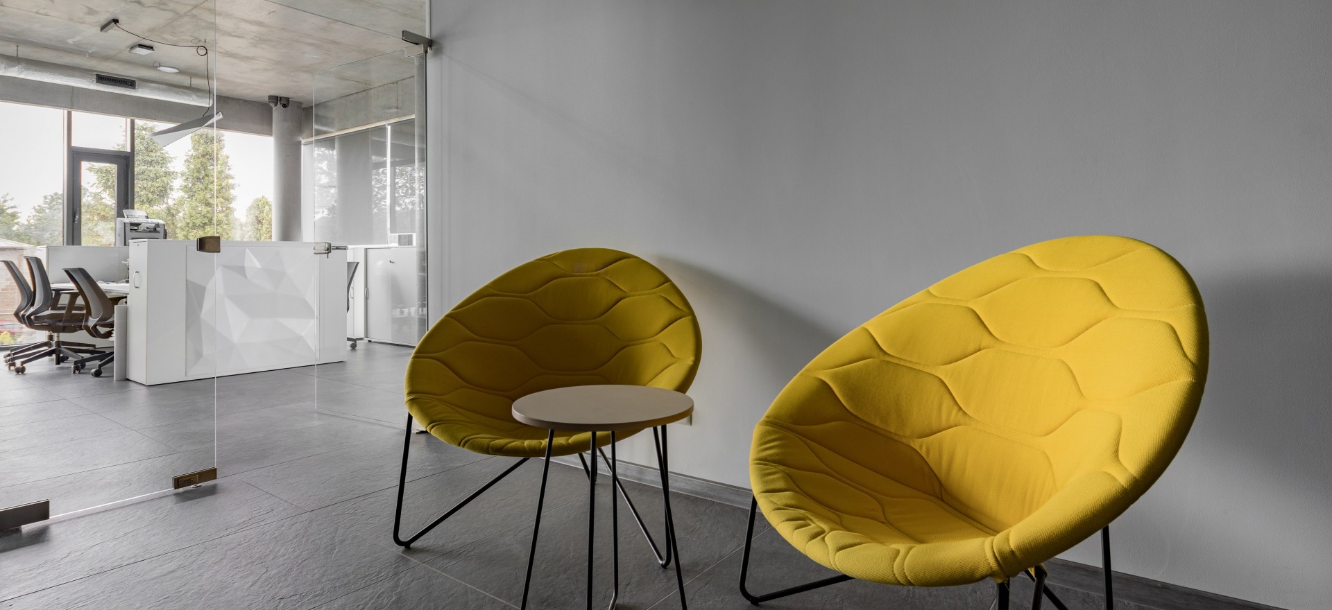 Le bâtiment a été divisé en plusieurs zones : des salles de travail, une zone d'entrée et une salle polyvalente servant de lieu de réunion. La division en zones a été mise en valeur par un agencement approprié de meubles Noti : les canapés Bouli suspendus accentuent l'espace ouvert devant la salle de conférence, les chaises, les tabourets et les tables Mishell dans les salles de détente préservent le design intérieur minimaliste, et les fauteuils Comfee donnent un sentiment de confort et d'unicité à l'intérieur.