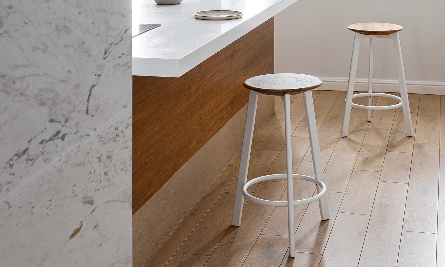 Eine große Auswahl an Polsterstoffen und Ledern aus dem Musterbuch sowie die verfügbare Holzfarbpalette ermöglichen es, den Hocker auch in die anspruchsvollsten Innenräume zu integrieren.