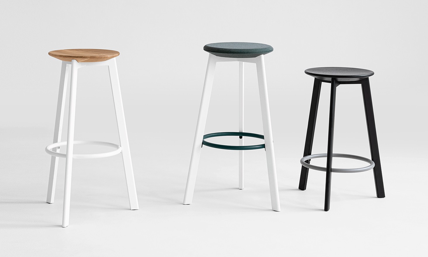 Die Hocker werden in 2 Höhen angeboten. In einen Version mit Holzsitz: 65 und 77 cm. In der Version mit gepolstertem Sitz: 66 und 78 cm.