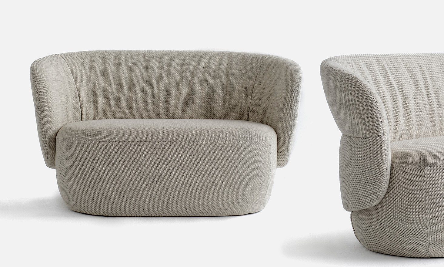 Die Familie von Sesseln und Sofas zeichnet sich durch den tiefen Einschnitt auf der Rückseite der Rückenlehne aus, der einer Taille ähnelt und die Rückenlehne in zwei Teile teilt. Diese Behandlung verleiht der Form Ausdruckskraft und lässt sie aus jeder Innenperspektive ins Auge fallen.