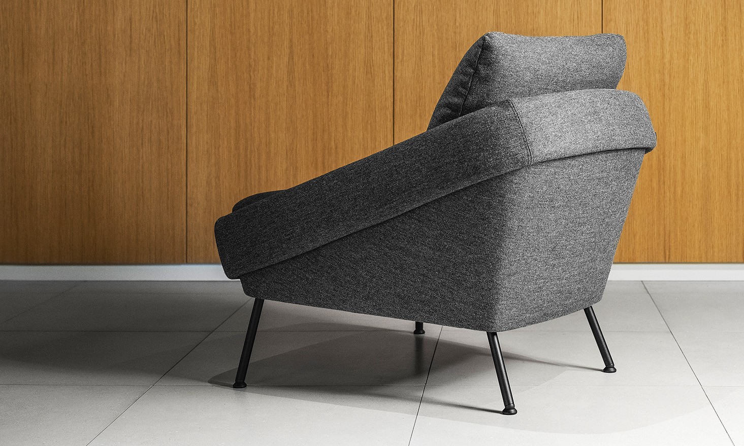 Die charakteristische Form des losen Rückenkissens mit sichtbarer horizontaler Teilung unterstreicht die Ergonomie des Sitzes und den Komfort der Rückenlehne und verleiht ihm gleichzeitig visuell einen markanten Charakter.