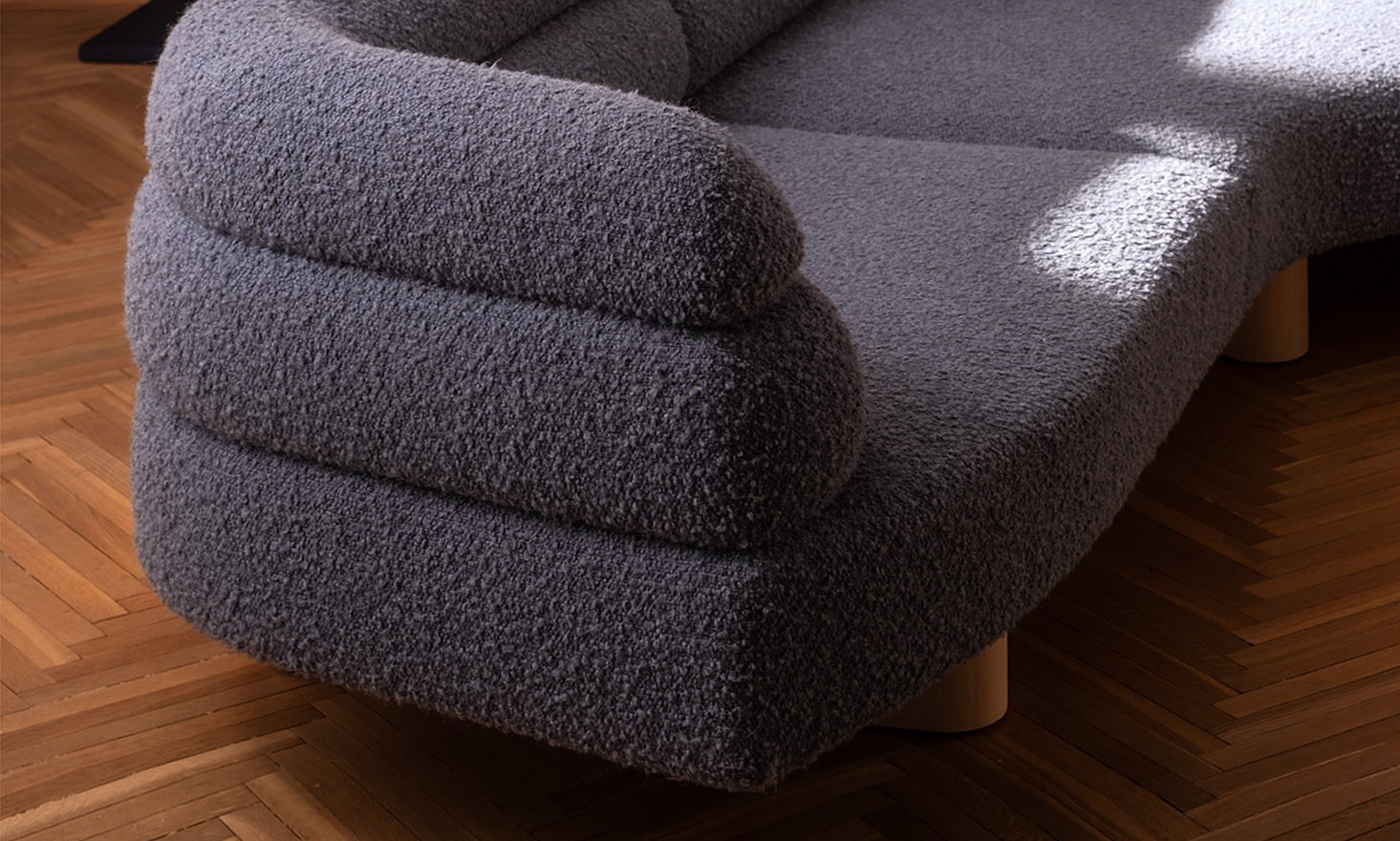 Die sorgfältig modellierten Körper des Sofas auf gepolsterten Beinen verweisen in ihrer Form auf die traditionellen japanischen Geta-Schuhe. Das Zurücksetzen der Beine unter die Sitzfläche verleiht dem Möbel Leichtigkeit und räumlichen Abstand vom Boden.