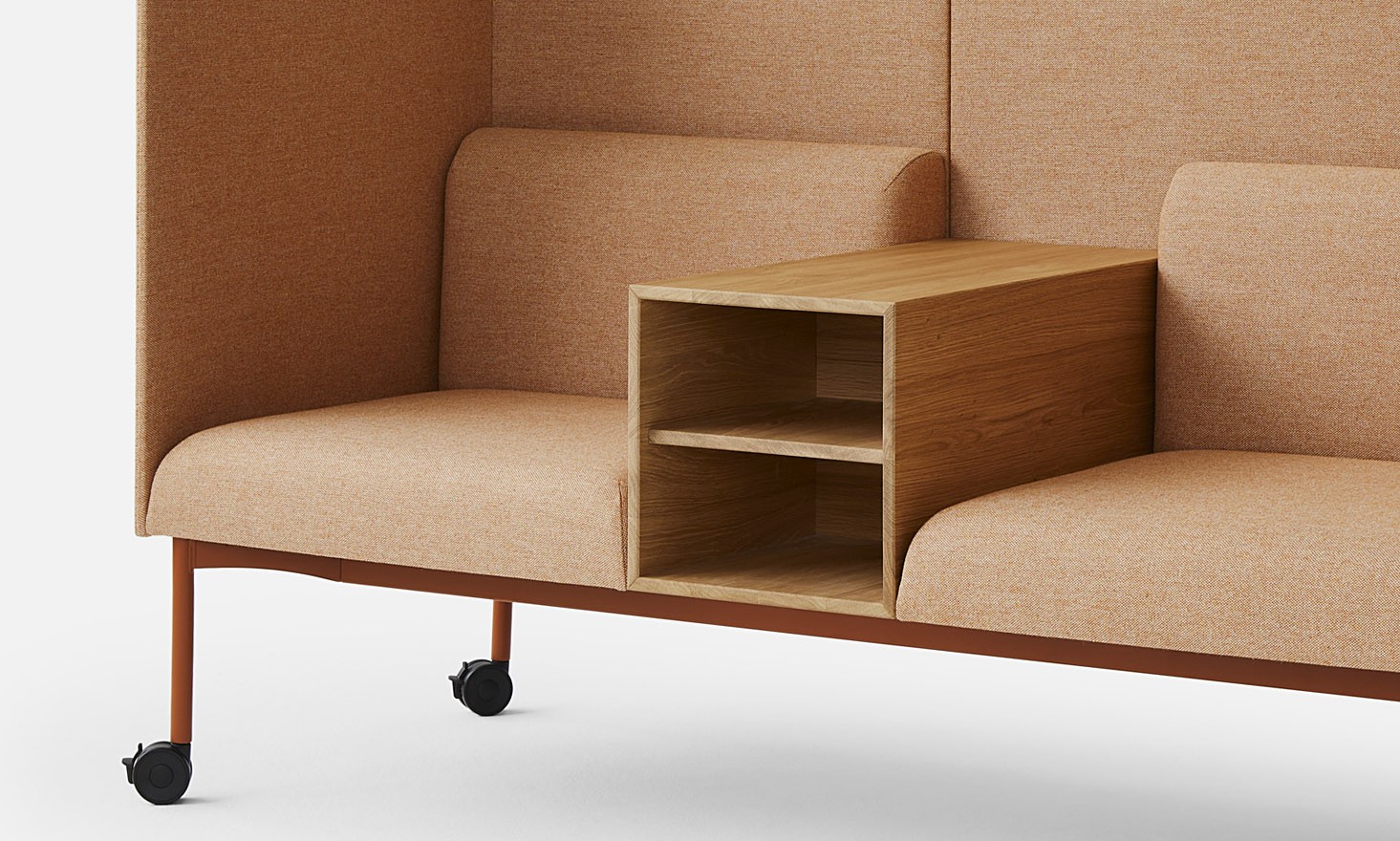Ein charakteristisches Merkmal der Kollektion sind zusätzliche, an den Rückenlehnen angebrachte Blenden, die je nach Wahl der Höhe Arbeits- oder Freizeiträume klar voneinander trennen oder sanft abdecken können, während sie die Formel des Sofas oder Sessels offen halten. Möglich ist zudem eine Umkehrung der Module sowie bei großen Inseln die Verbindung der Rückenlehnen auf eine solche Weise, dass sie zwei in entgegengesetzte Seiten ausgerichtete Reihen bilden.