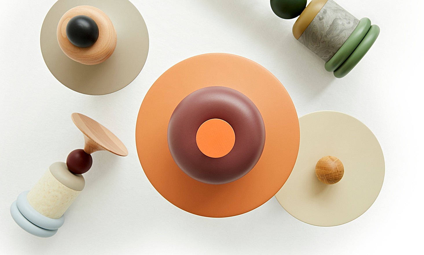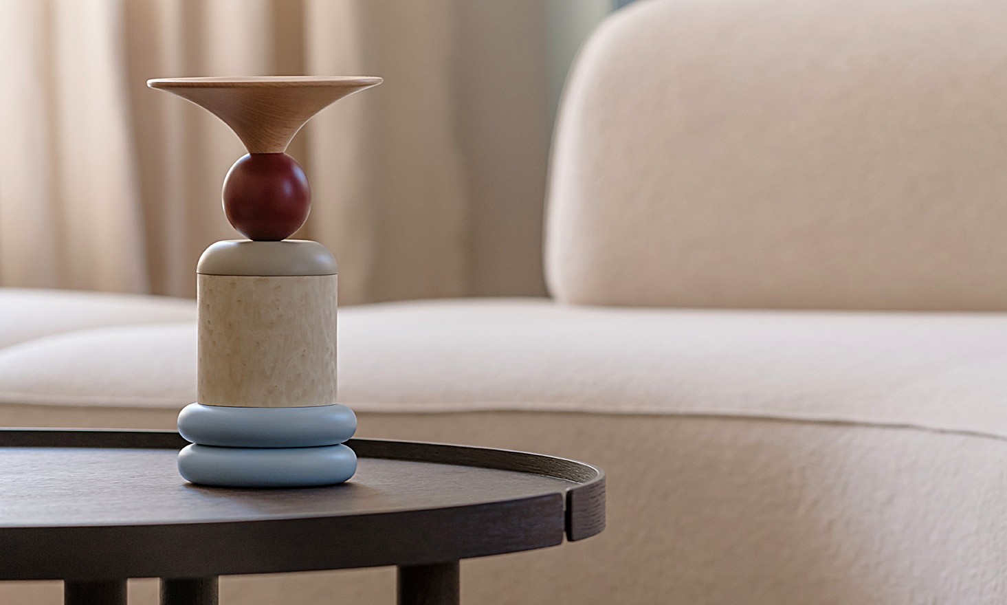 In den fünf Größen der einzelnen Totems findet sich ihr eigener, individueller Charakter wieder. Einerseits wird die wirbelnde Energie durch die Zylinder erreicht, die die Achse der Totems bilden, während die kunstvoll ausgeführten Formen des "Spinners" und der "Trompete" ihre massive Struktur visuell aufbrechen. Indem sie eine kreisförmige Bewegung ausstrahlen, unterstreichen sie die Rotationsbewegung der Drehbank, auf der sie entstanden sind. Andererseits bringen die Objekte durch ihre Farben Leben und Schwung in die Innenräume und schaffen spannende Blickpunkte mit Eigenschaften, die von ruhig und zurückhaltend bis hin zu energisch und temperamentvoll reichen.