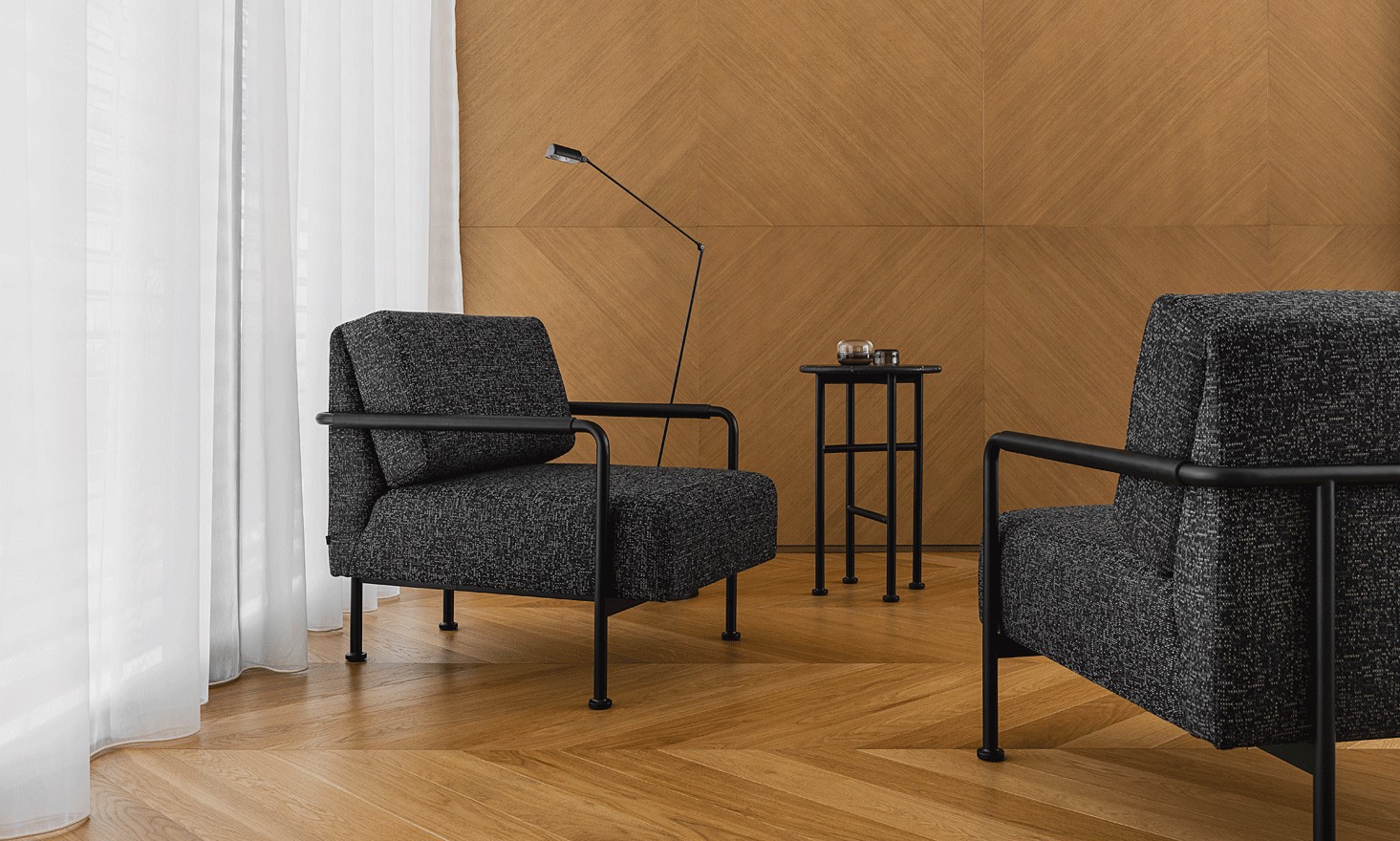 The seats are placed on legs made of oak wood in a natural colour or black-painted steel.