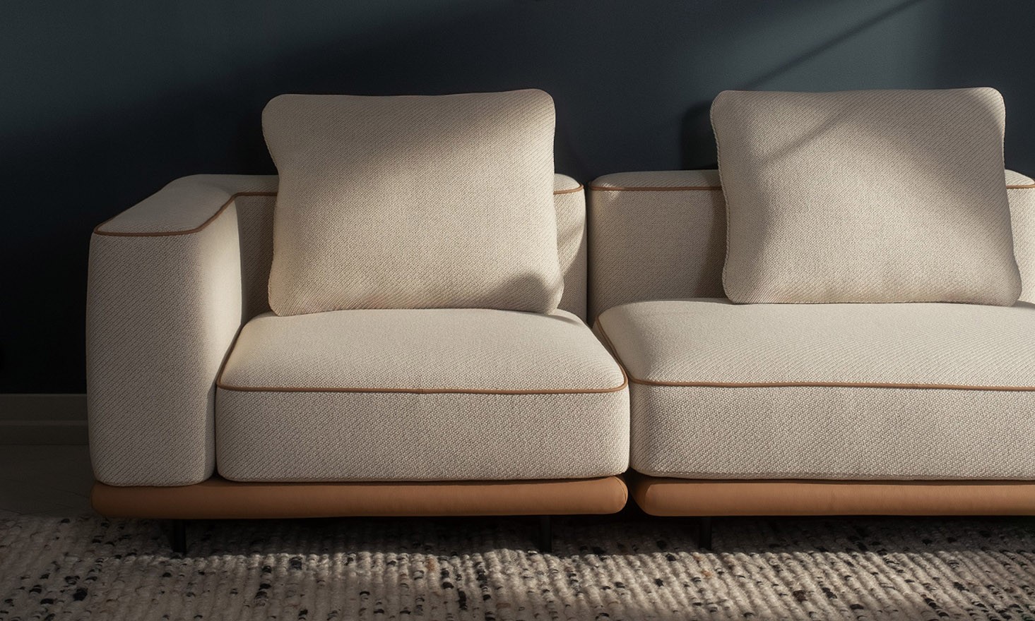 The rounded base and horizontal stitching further emphasize the sofa’s layered structure, giving it a distinctive, topographic character.