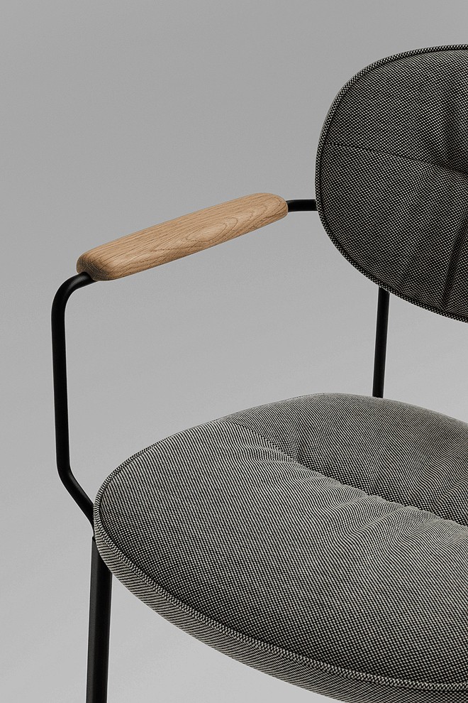 Le fauteuil et la chaise Algo sont disponibles en deux options : en contreplaqué de hêtre avec un placage de parement et des accoudoirs en chêne (les accoudoirs toujours de la même couleur que le placage) ou rembourré avec des accoudoirs en chêne.