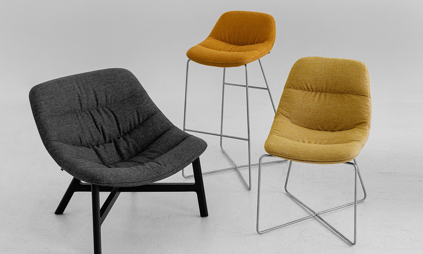 Un large choix de tissus et de piètements permet de personnaliser les différents éléments de la collection et de déterminer leur fonction dans le projet.