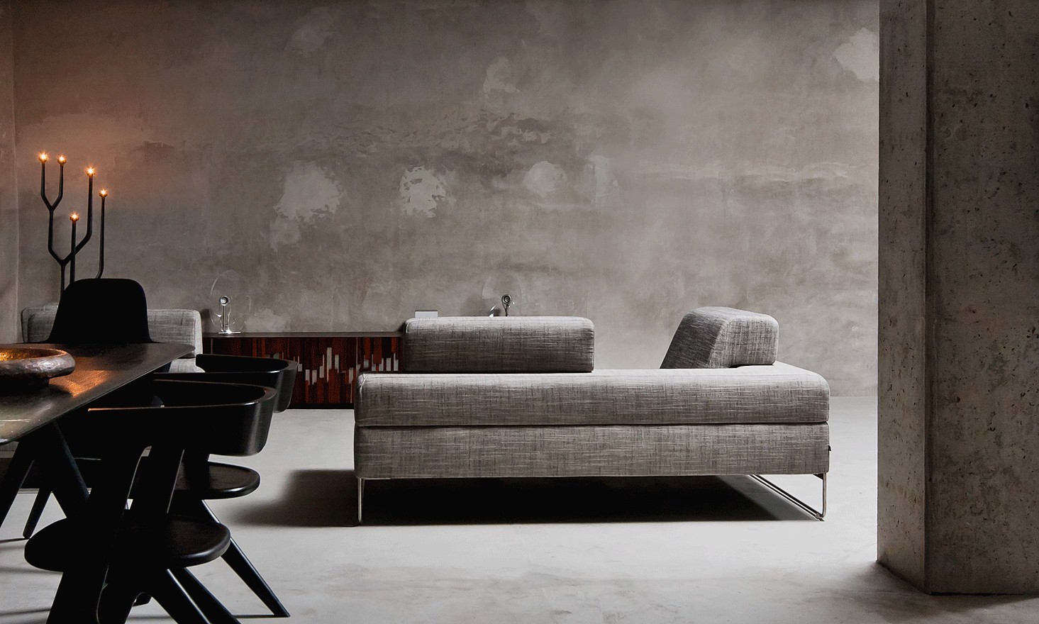 Elle se caractérise par les formes horizontales des dossiers bas, avec des coussins bien ajustés. Leur forme et leur mobilité garantissent non seulement un appui confortable, mais aussi, comme ils peuvent être repositionnés et tournés, une large gamme d'arrangements.