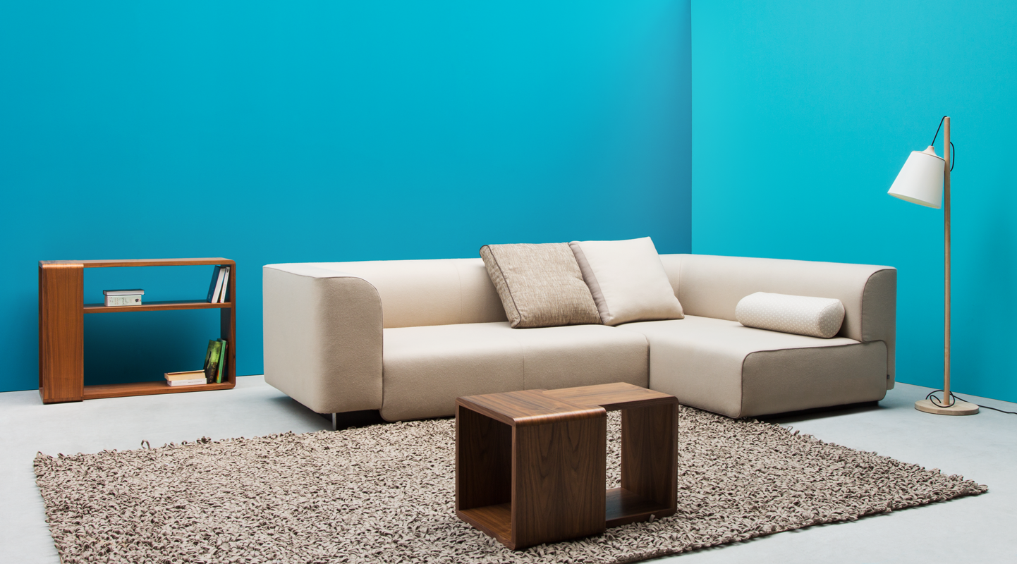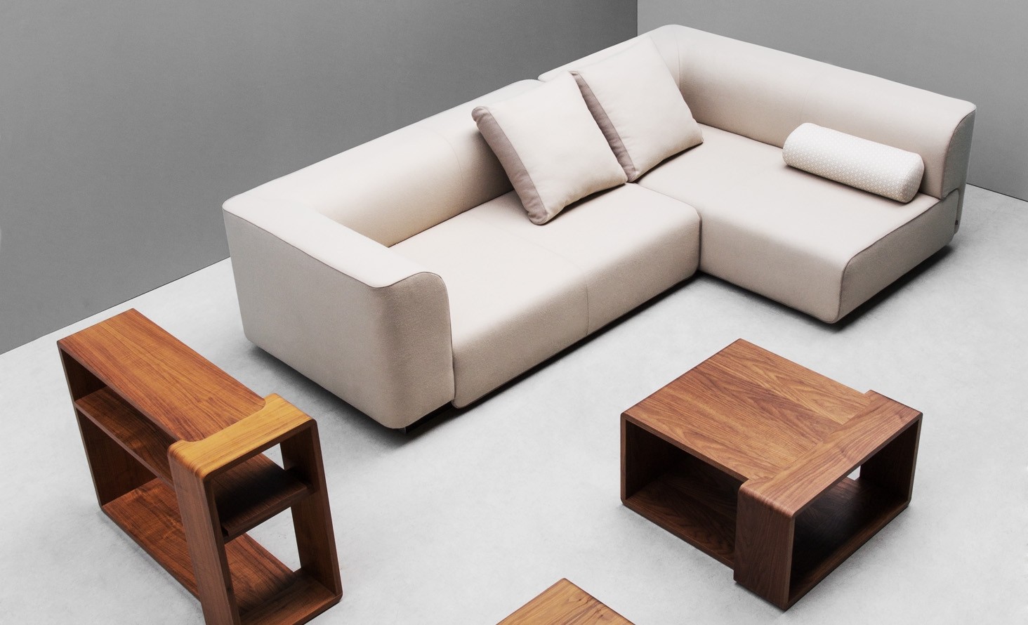 Zastosowanie dwóch tkanin o różnej kolorystyce, fakturze lub wzorze podkreśla ich wyjątkową linę. Do kanap Piotr Kuchciński zaprojektował poduszki oraz wałki, które zdobią mebel, a jednocześnie optymalizują jego głębokość. Kolekcję uzupełniają drewniane regały i stoliki.