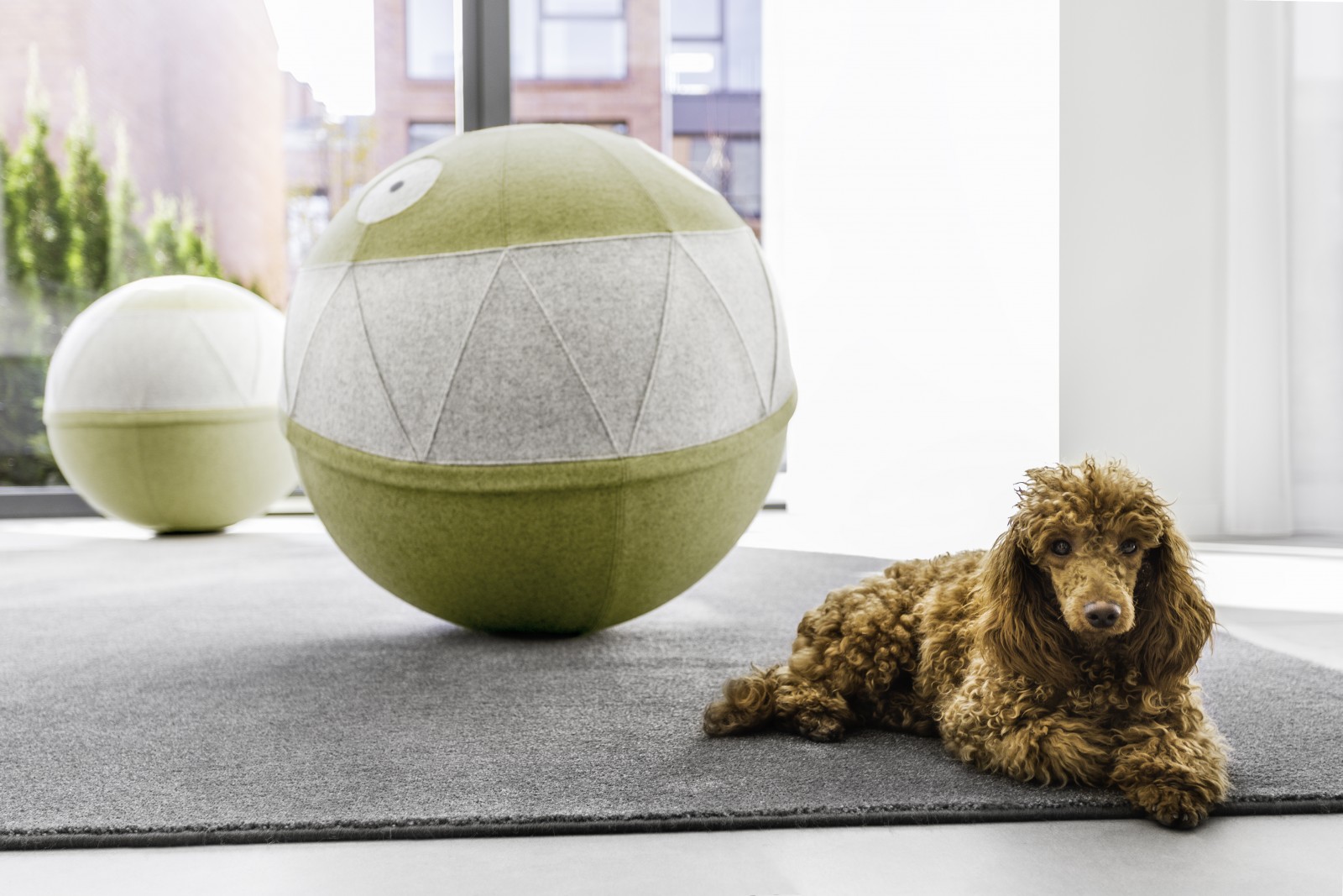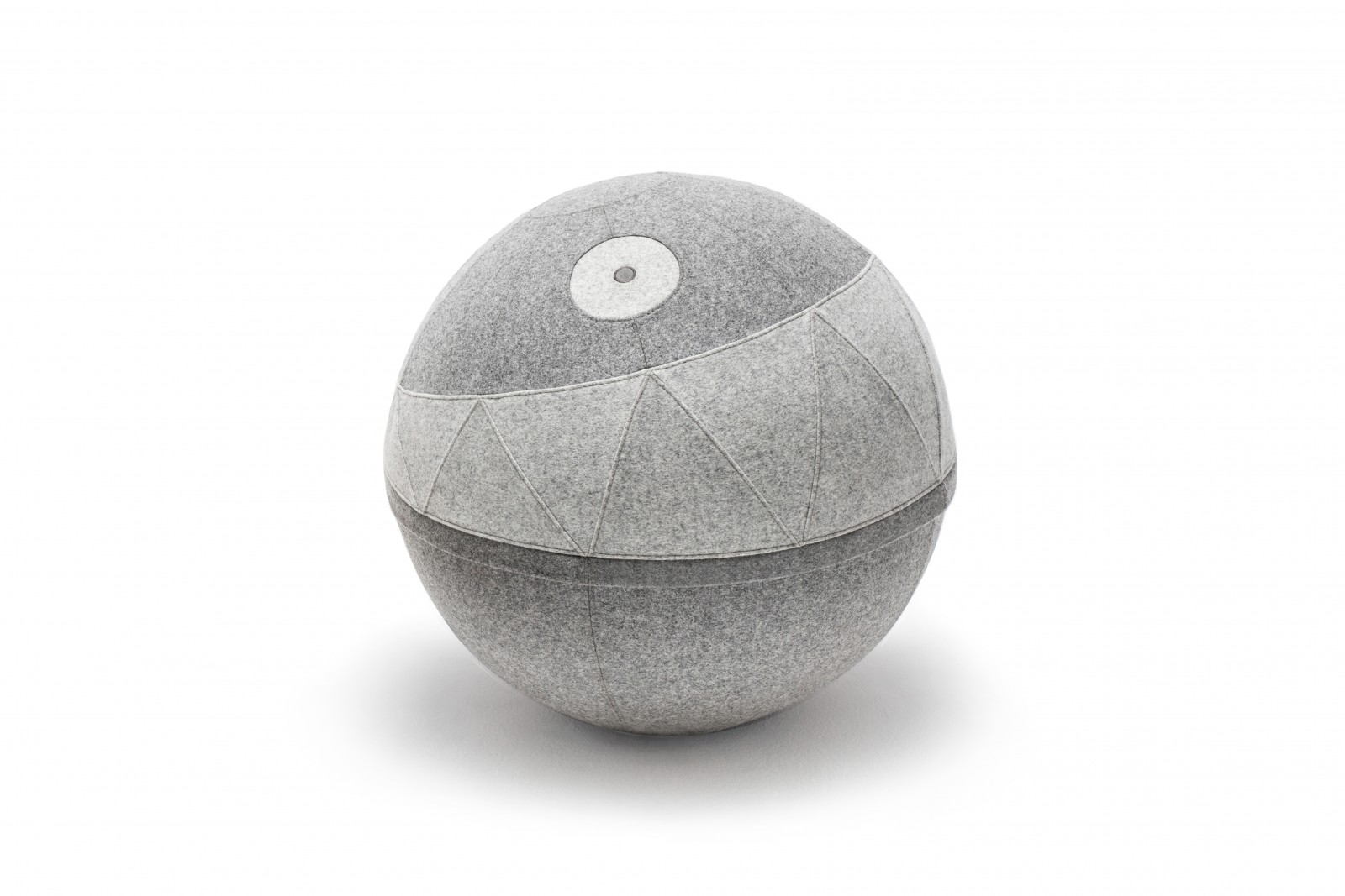 Ten designerski puf to mebel lekki, mobilny i wygodny. Tapicerowany 100% wełną pokrowiec ukrywa gumową piłkę o wielkości 65 cm. Po włożeniu piłki, napompowaniu, załączoną do opakowania pompką i zapięciu zamka wokół piłki powstaje puf. Dzięki obciążeniu w dolnej części, ustawia się on na podłożu w jednej pozycji, utrzymując wzór.